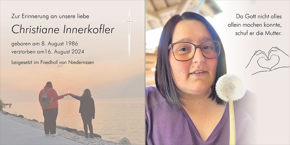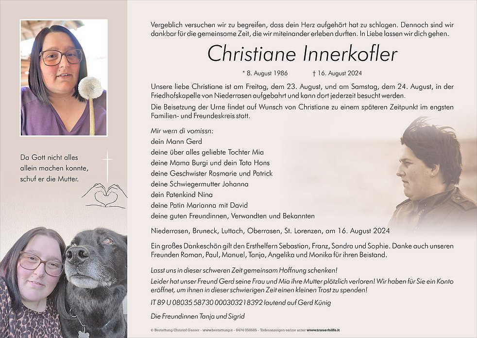 Unsere liebe Christiane ist am Freitag, dem 23. August, und am Samstag, dem 24. August, in der Friedhofskapelle von Niederrasen aufgebahrt und kann dort jederzeit besucht werden.