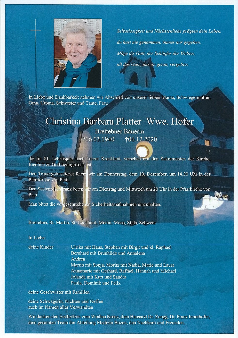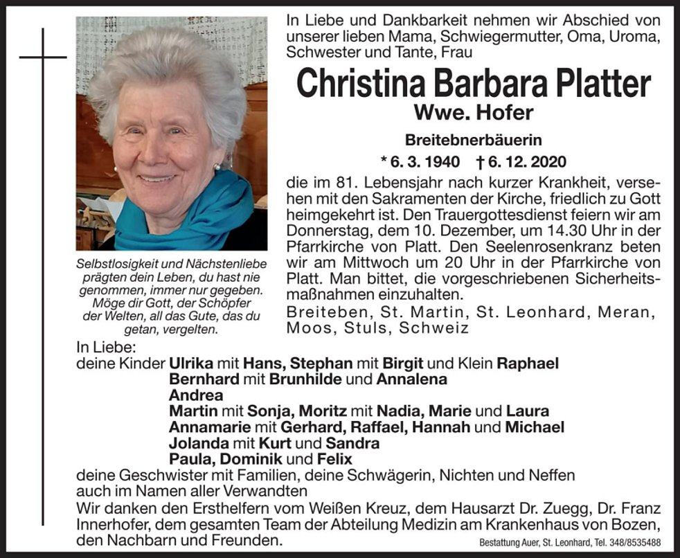Den Trauergottesdienst feiern wir am Donnerstag, dem 10. Dezember, um 14.30 Uhr in der Pfarrkirche von Platt.