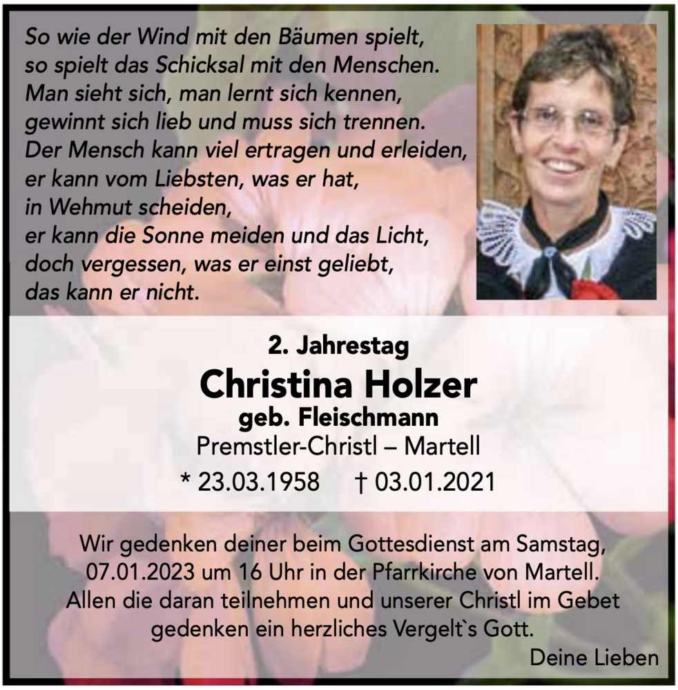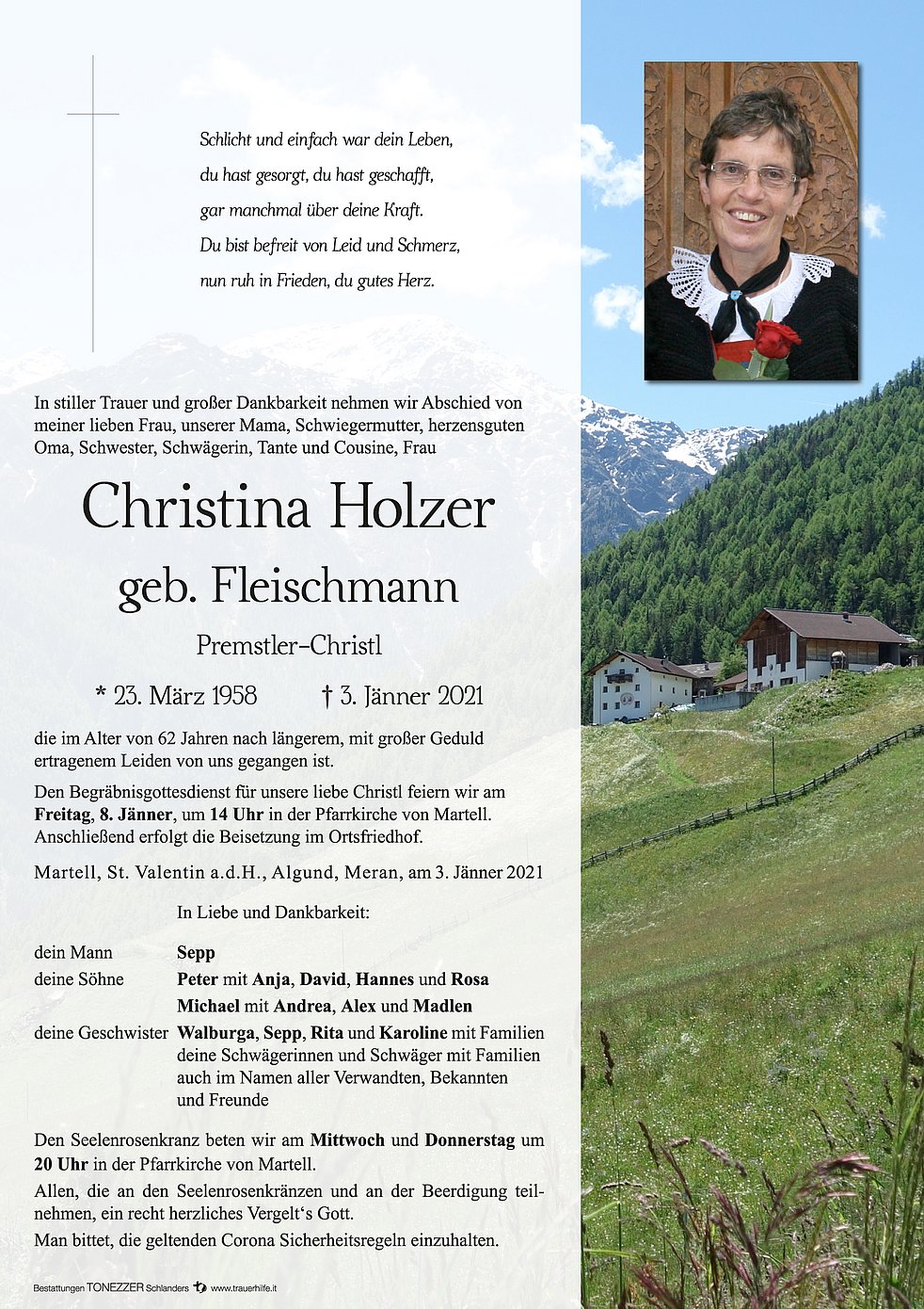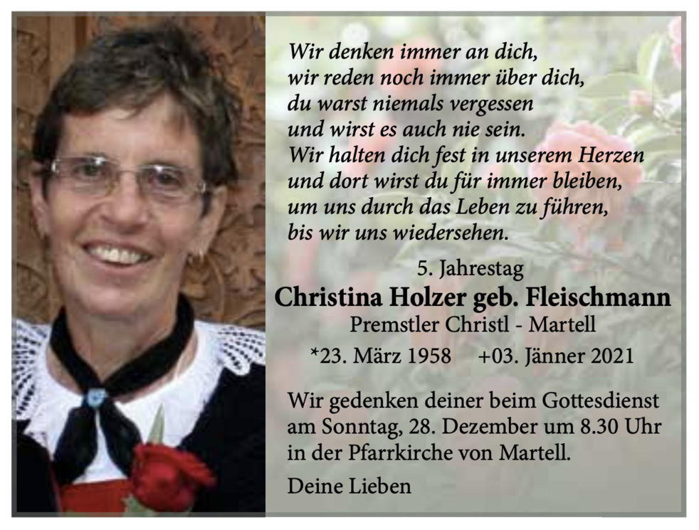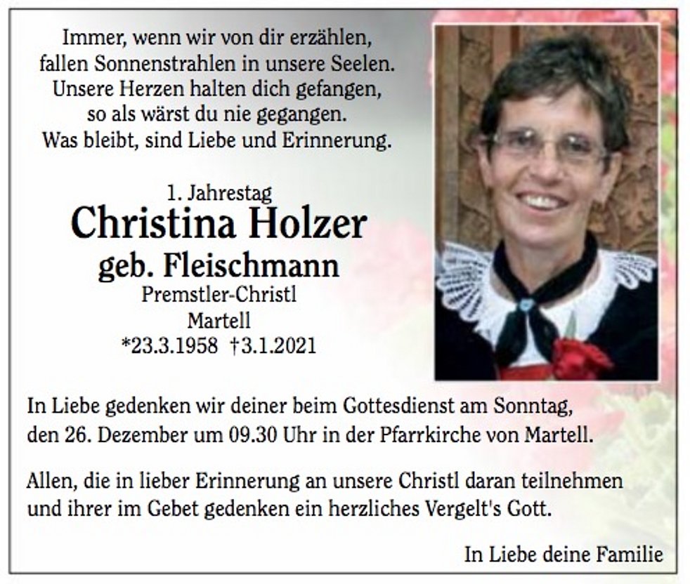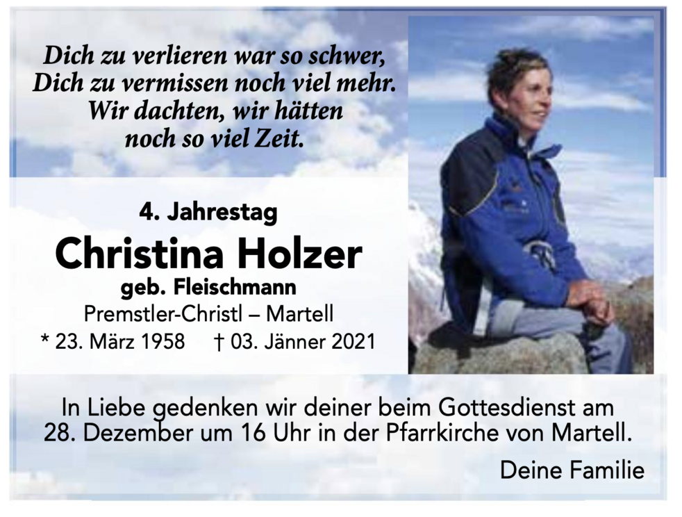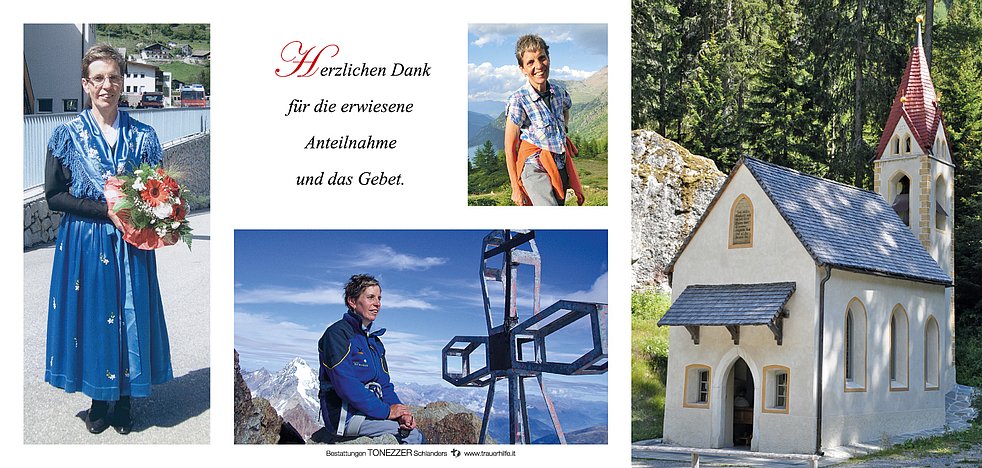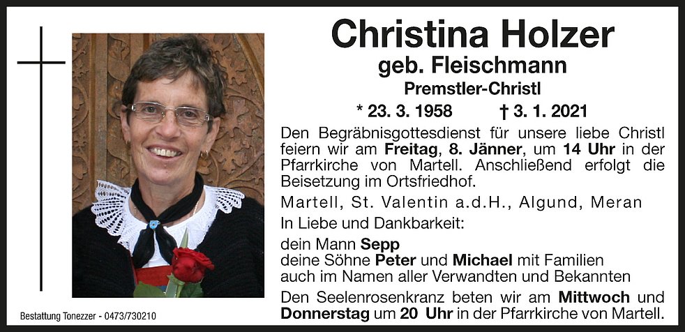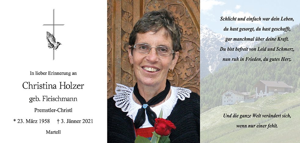 Den Begräbnisgottesdienst für unsere liebe Christl feiern wir am Freitag, 8. Jänner, um 14 Uhr in der Pfarrkirche von Martell.
