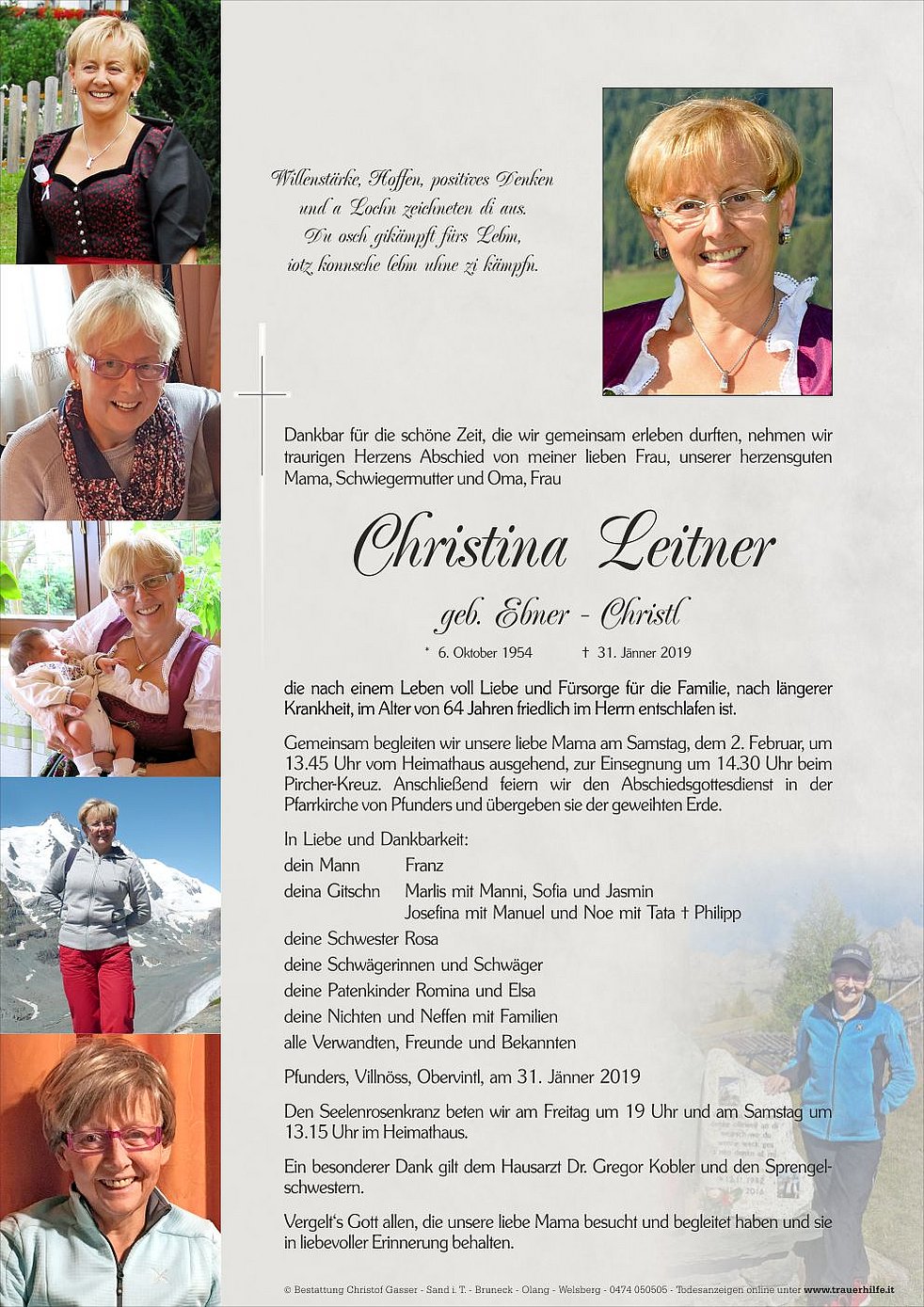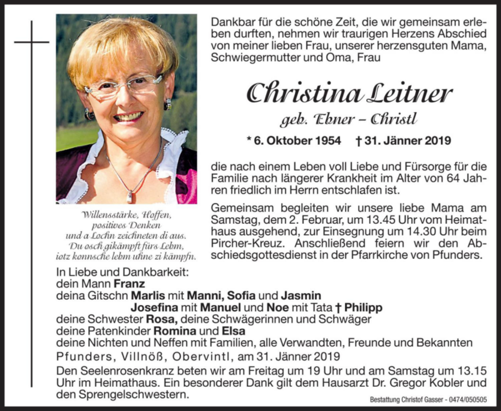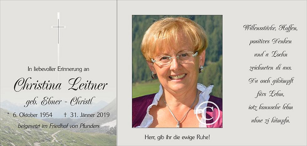 Gemeinsam begleiten wir unsere liebe Mama am Samstag, dem 2. Februar, um 13.45 Uhr vom Heimathaus ausgehend, zur Einsegnung um 14.30 Uhr beim Pircher-Kreuz. Anschließend feiern wir den Abschiedsgottesdienst in der Pfarrkirche von Pfunders und übergeben sie der geweihten Erde.