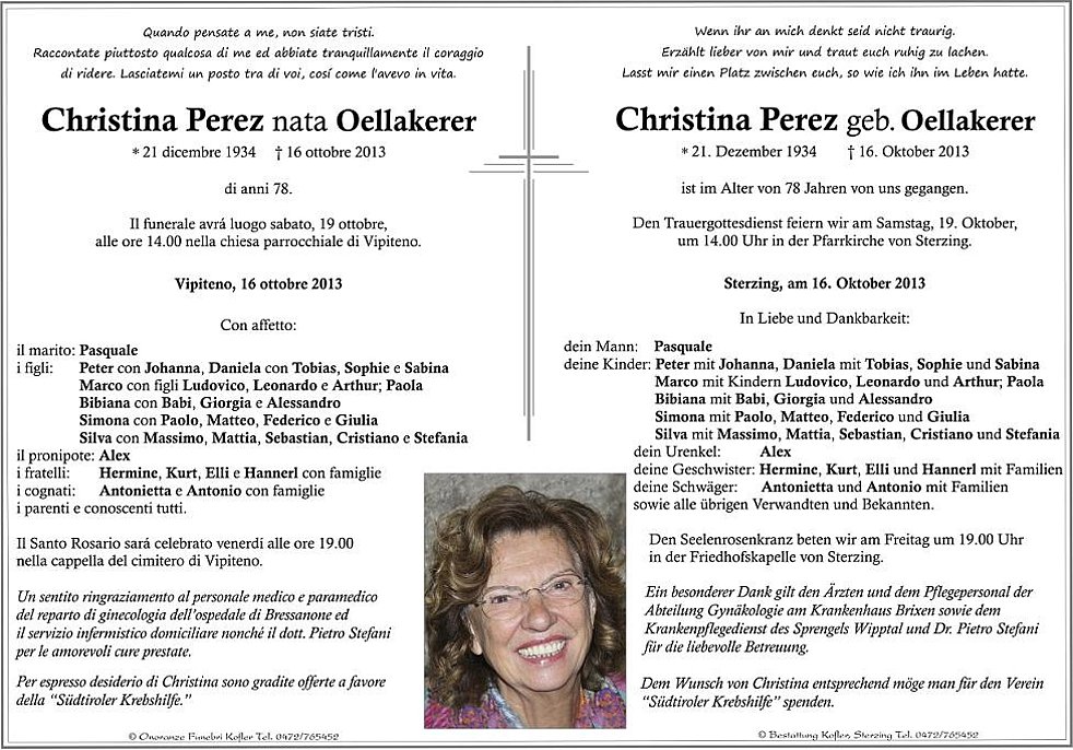 Un sentito ringraziamento al personale medico e paramedico del reparto di ginecologia dell’ospedale di Bressanone ed il servizio infermistico domiciliare nonché il dott. Pietro Stefani per le amorevoli cure prestate.