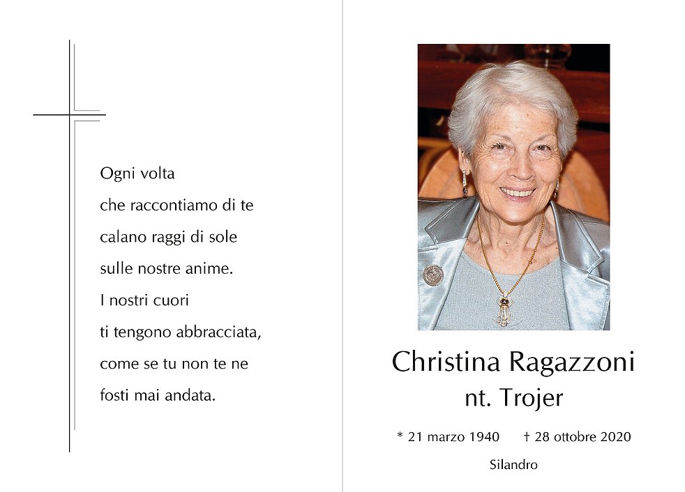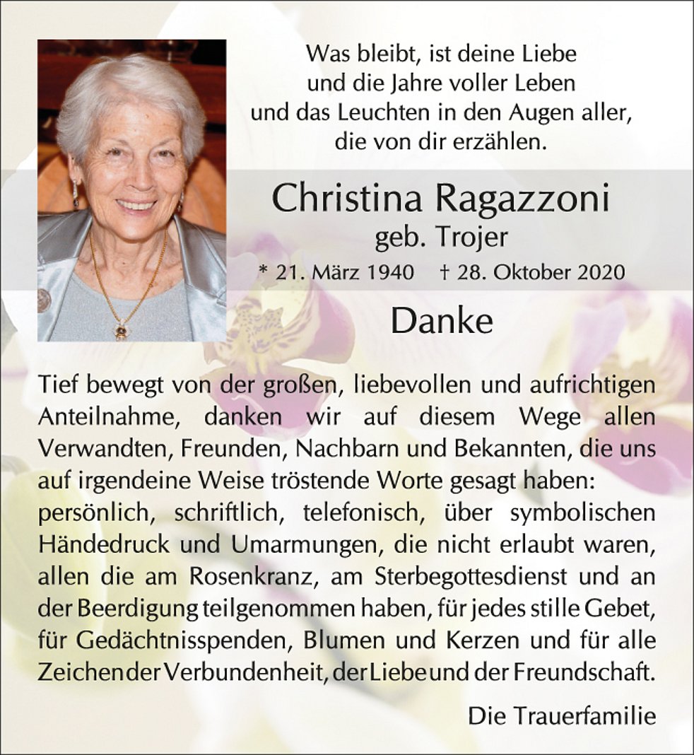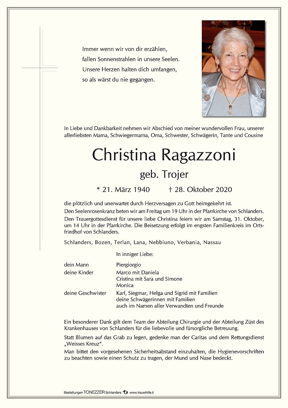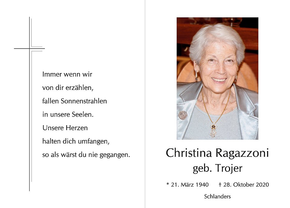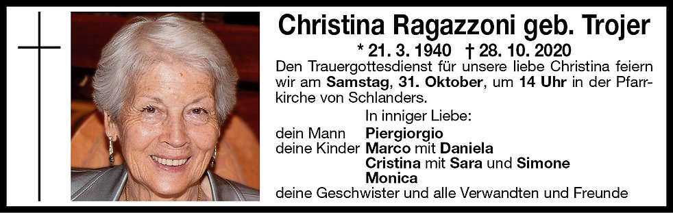 Den Seelenrosenkranz beten wir am Freitag um 19 Uhr in der Pfarrkirche von Schlanders. Den Trauergottesdienst für unsere liebe Christina feiern wir am Samstag, 31. Oktober, um 14 Uhr in der Pfarrkirche.