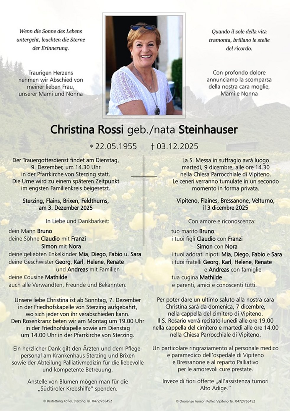 Per poter dare un ultimo saluto alla nostra cara Christina sarà da domenica, 7 dicembre, nella cappella del cimitero di Vipiteno.