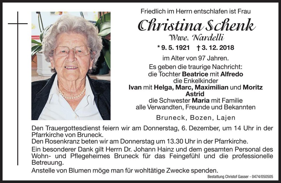Anstelle von Blumen möge man für wohltätige Zwecke spenden.