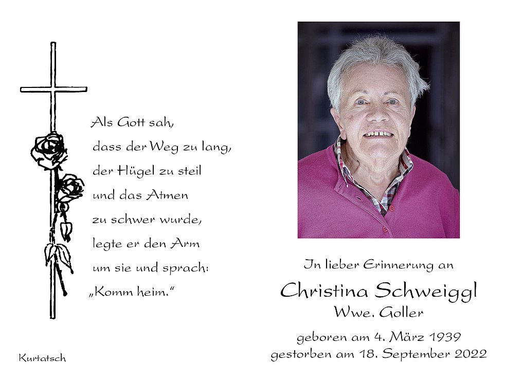 Den Trauergottesdienst feiern wir Donnerstag, dem 22. September um 16.30 Uhr in der Pfarrkirche von Kurtatsch. Anschließend begleiten wir unsere liebe Verstorbene auf den Ortsfriedhof.