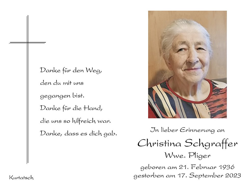 Am Donnerstag, 21. September 2023 feiern wir um 16.30 Uhr den Abschiedsgottesdienst in der Pfarrkirche von Kurtatsch und begleiten anschließend unsere Mama zur letzten Ruhe auf den Ortsfriedhof.