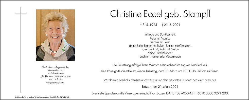 Eventuelle Spenden an die Vinzenzgemeinschaft von Bozen. IBAN: IT08 A 06045 11601 0000 0027 1200