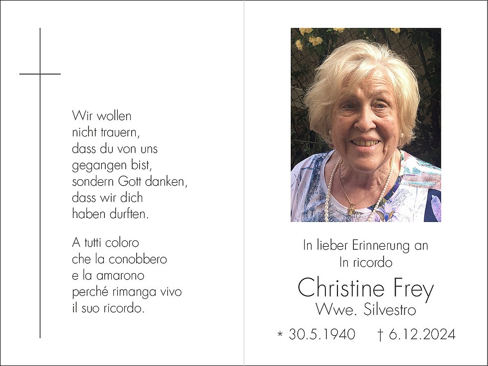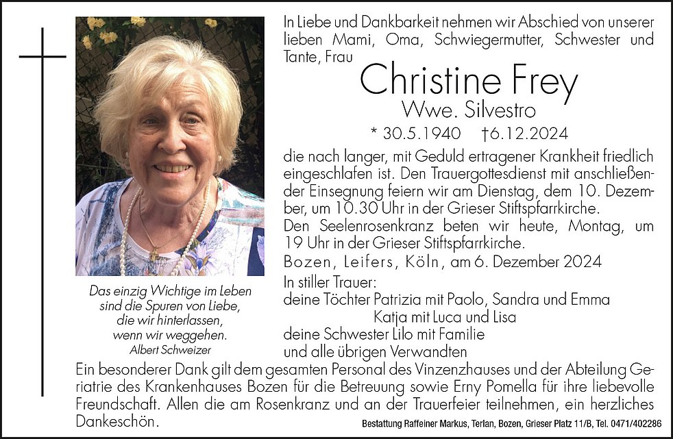 Den Trauergottesdienst mit anschließender Einsegnung feiern wir am Dienstag, dem 10. Dezember, um 10.30 Uhr in der Grieser Stiftspfarrkirche.