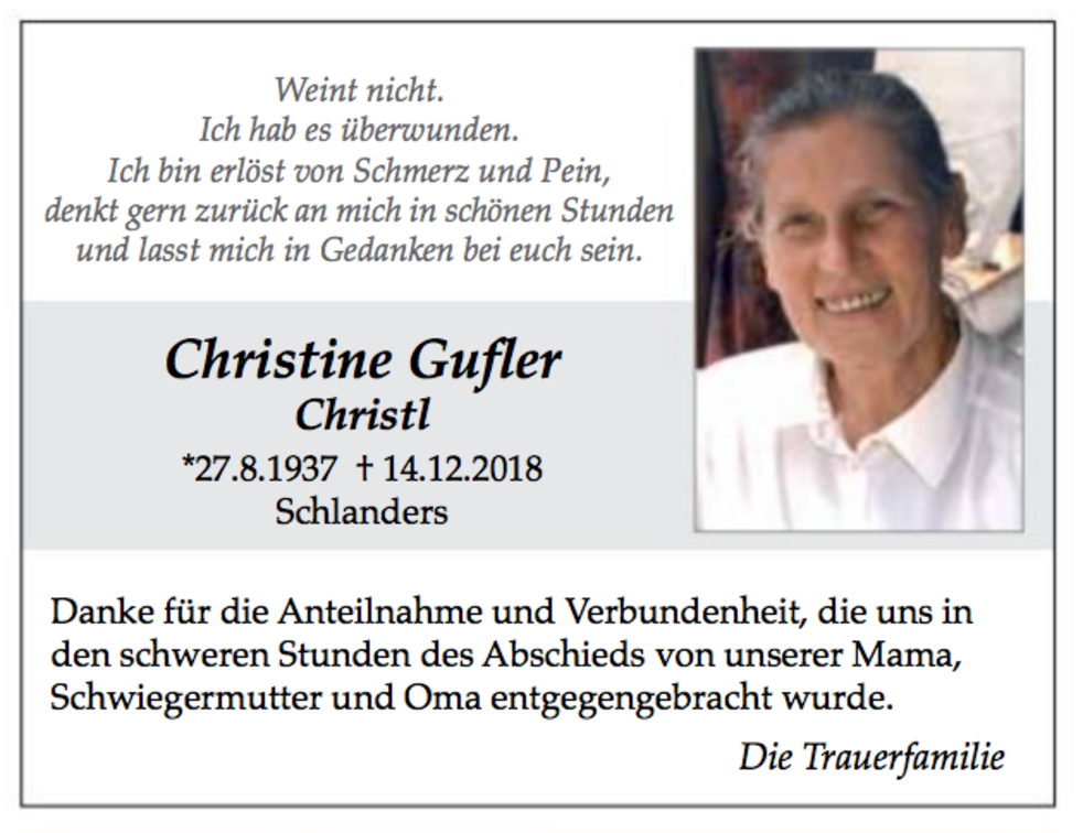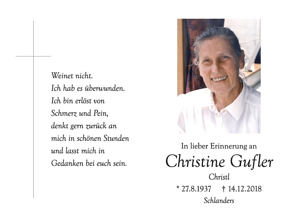 14 Uhr feiern wir den Begräbnisgottesdienst, und anschließend begleiten wir unsere liebe Christl zur letzten Ruhe auf den Ortsfriedhof von Schlanders.