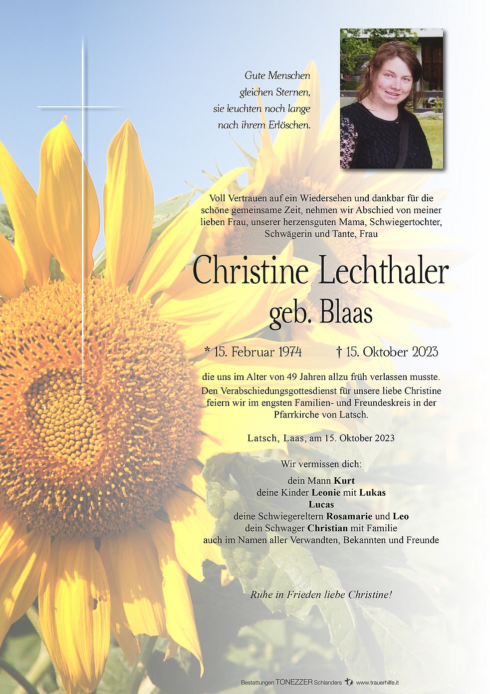 Den Verabschiedungsgottesdienst für unsere liebe Christine feiern wir im engsten Familien- und Freundeskreis in der Pfarrkirche von Latsch.