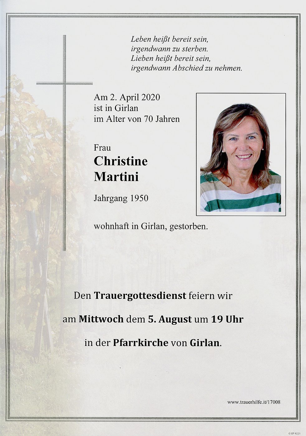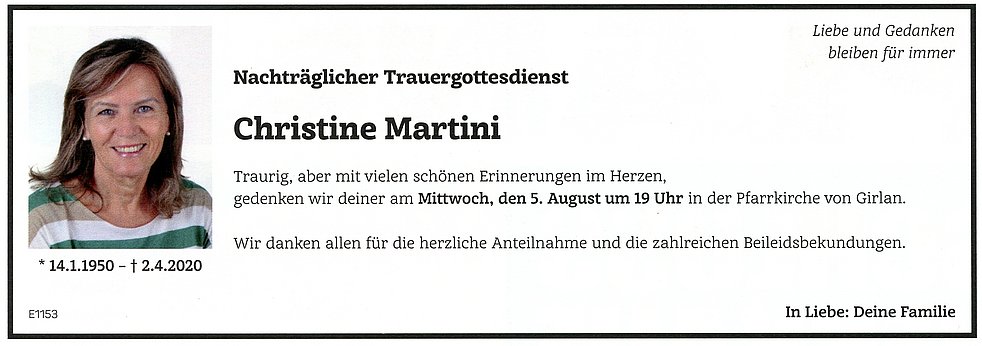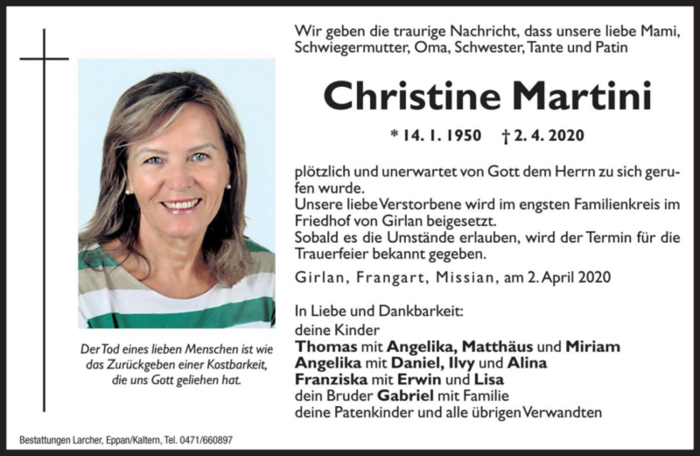 Den Trauergottesdienst feiern wir am Mittwoch dem 5. August um 19 Uhr in der Pfarrkirche von Girlan.