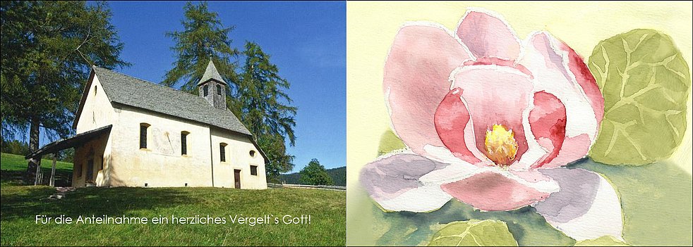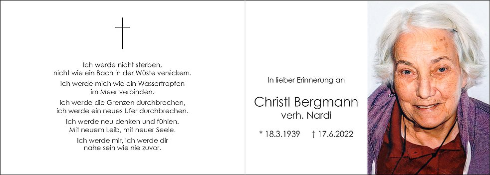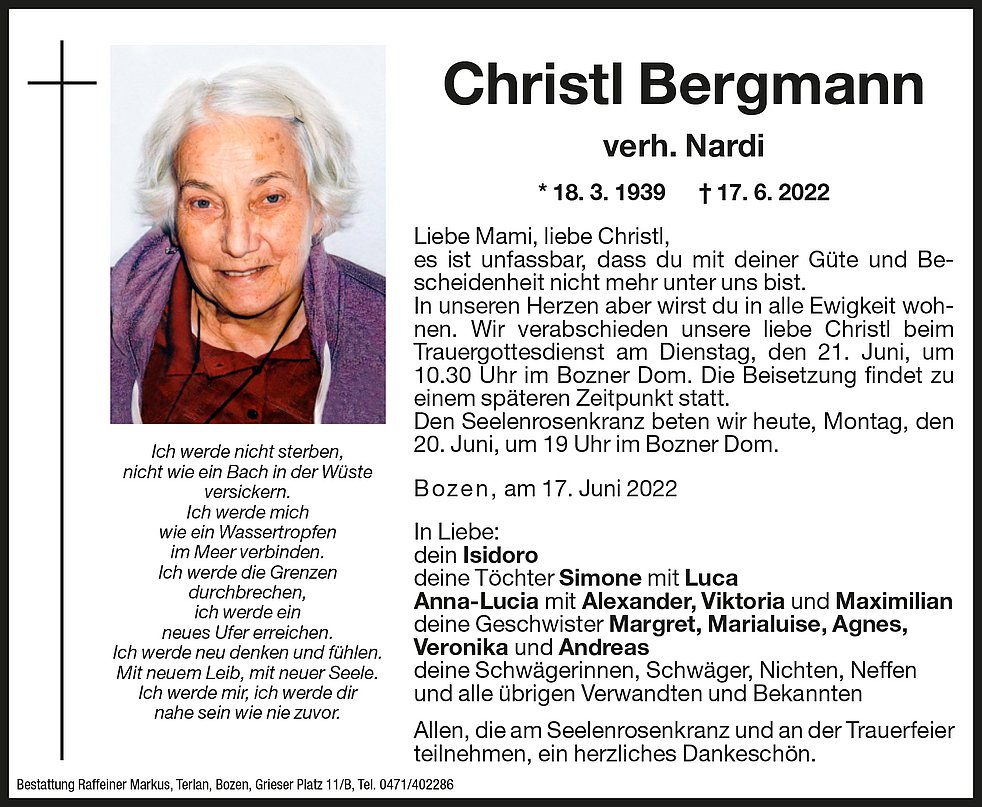 Wir verabschieden unsere liebe Christl beim Trauergottesdienst am Dienstag, den 21. Juni um 10.30 im Bozner Dom. Die Beisetzung findet zu einem späteren Zeitpunkt statt.