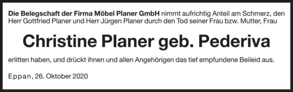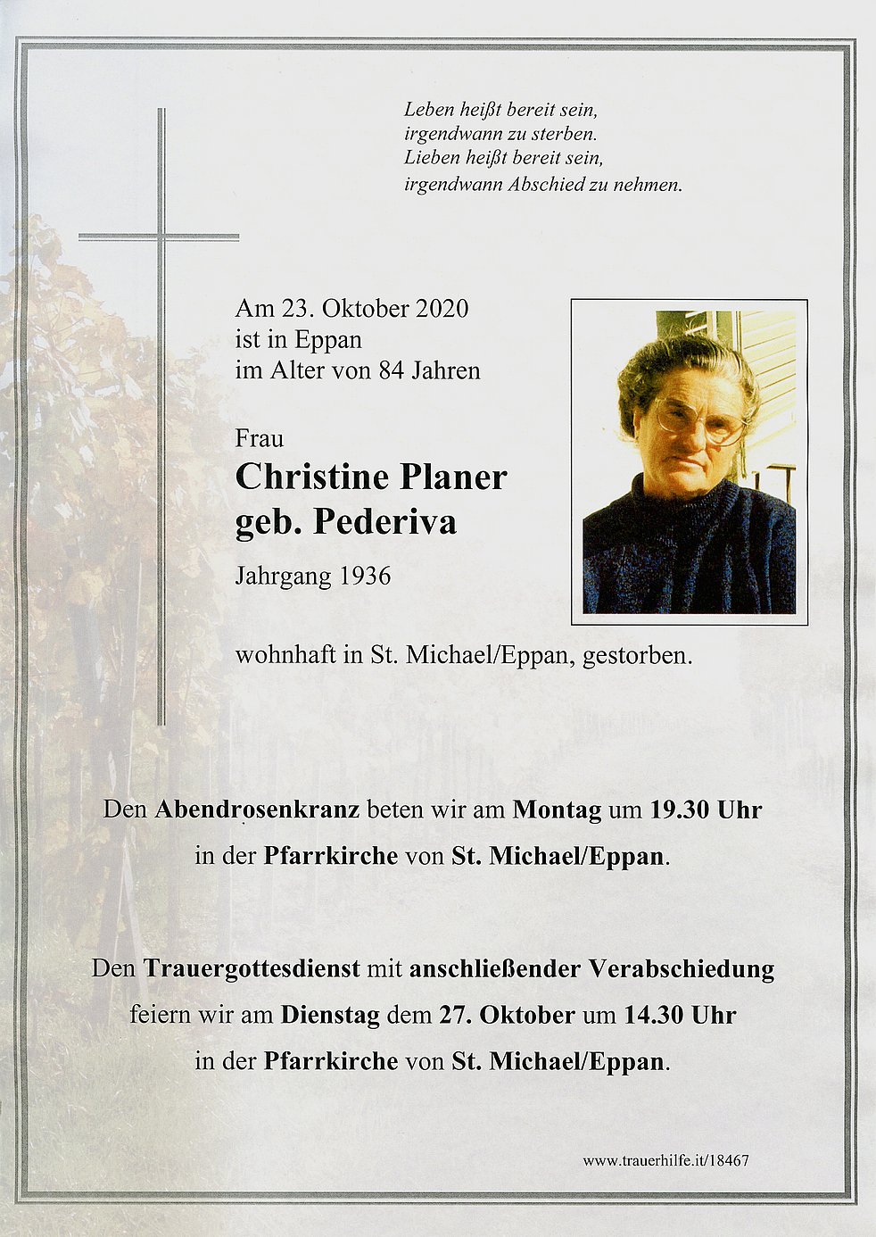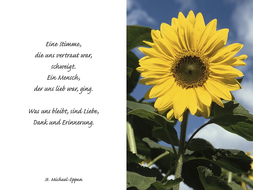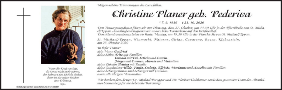 Den Trauergottesdienst mit anschließender Verabschiedung feiern wir am Dienstag, dem 27. Oktober um 14.30 Uhr in der Pfarrkirche von St. Michael/Eppan.