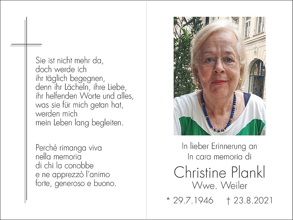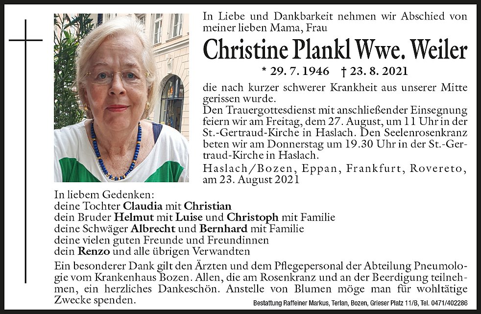 Den Trauergottesdienst mit anschließender Einsegnung feiern wir am Freitag, dem 27. August, um 11.00 Uhr in der St. Gertraud Kirche in Haslach.