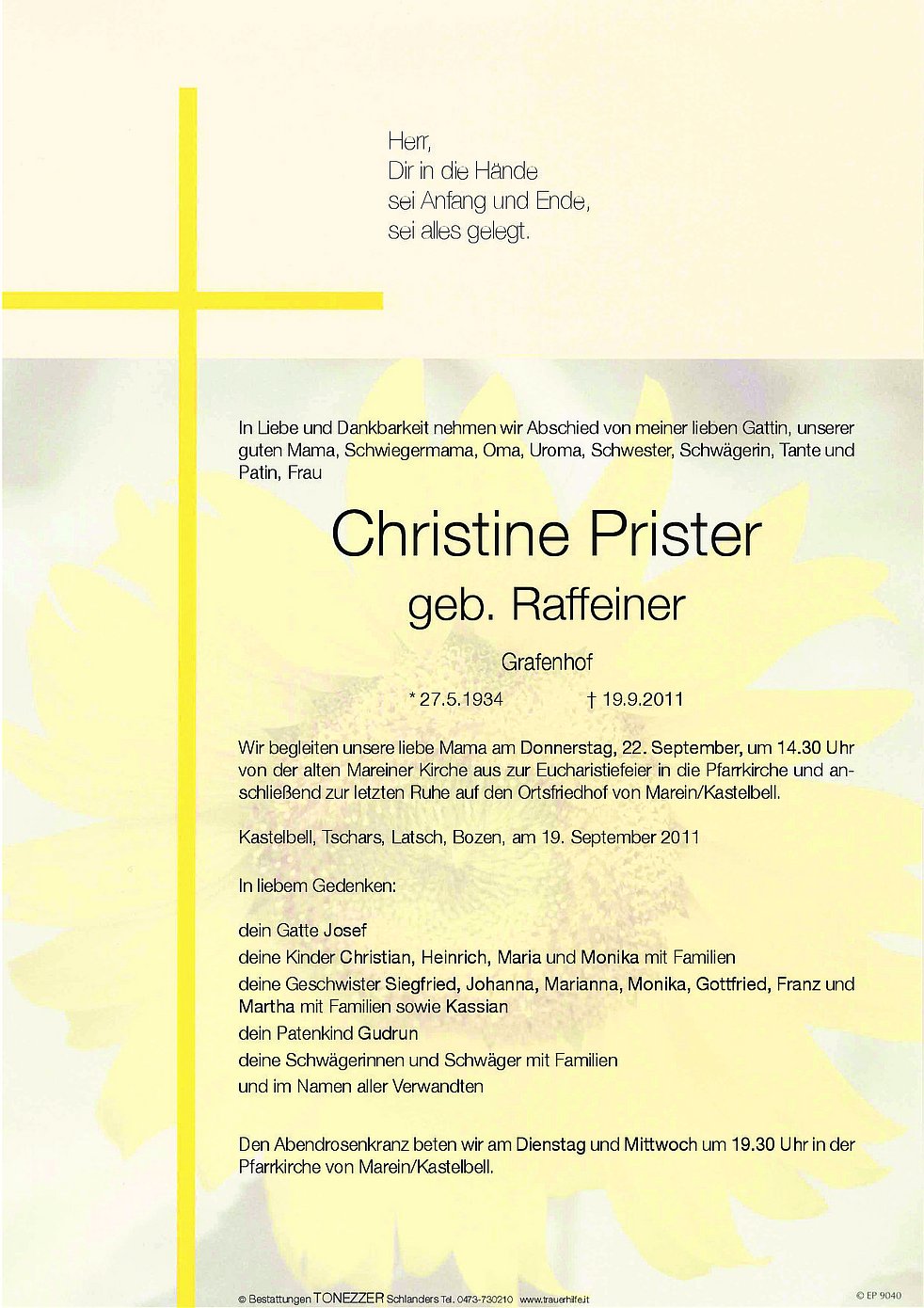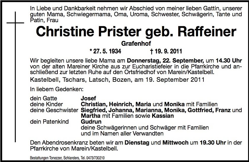 Wir begleiten unsere liebe Mama am Donnerstag, 22. September, um 14.30 Uhr von der alten Mareiner Kirche aus zur Eucharistiefeier in die Pfarrkirche und anschließend zur letzten Ruhe auf den Ortsfriedhof von Marein/Kastelbell.