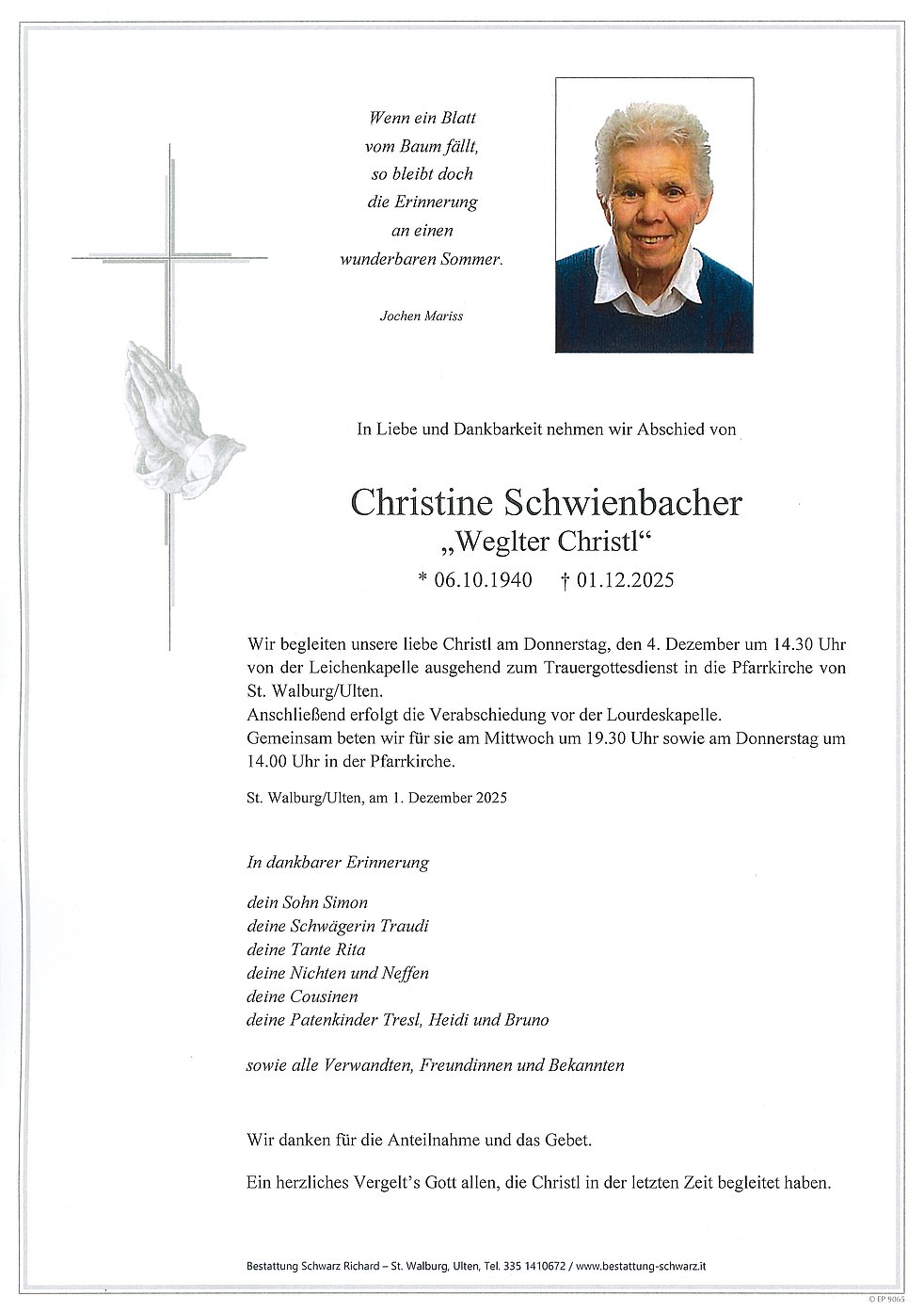 Wir begleiten unsere liebe Christl am Donnerstag, den 4. Dezember um 14.30 Uhr von der Leichenkapelle ausgehend zum Trauergottesdienst in die Pfarrkirche von St. Walburg/Ulten.