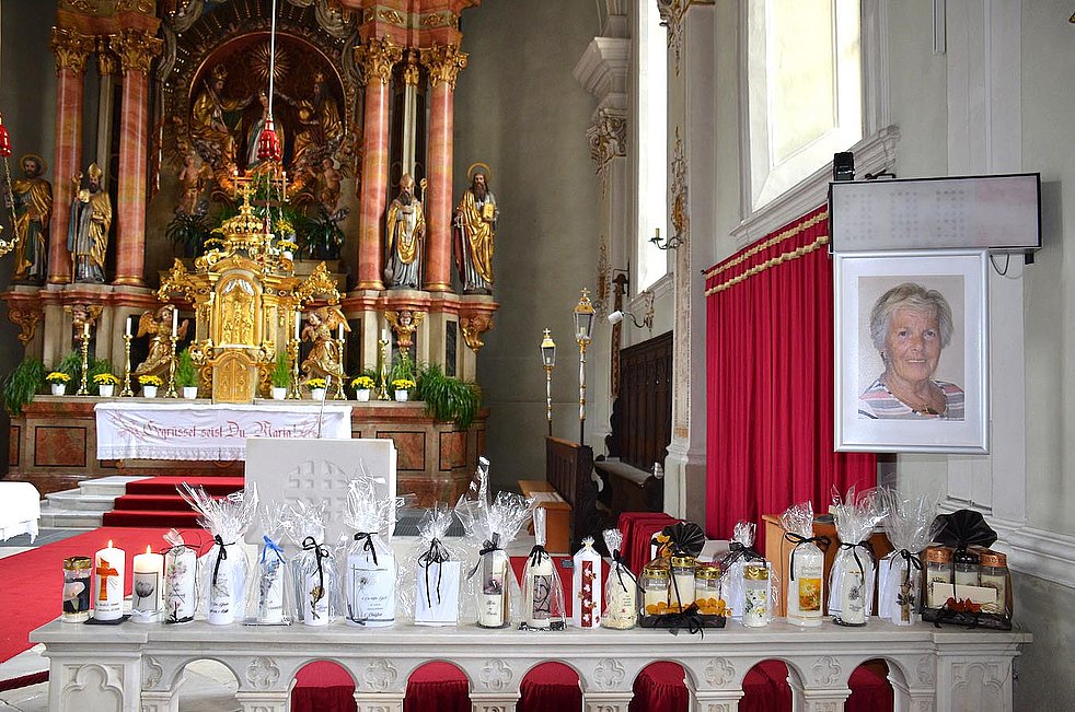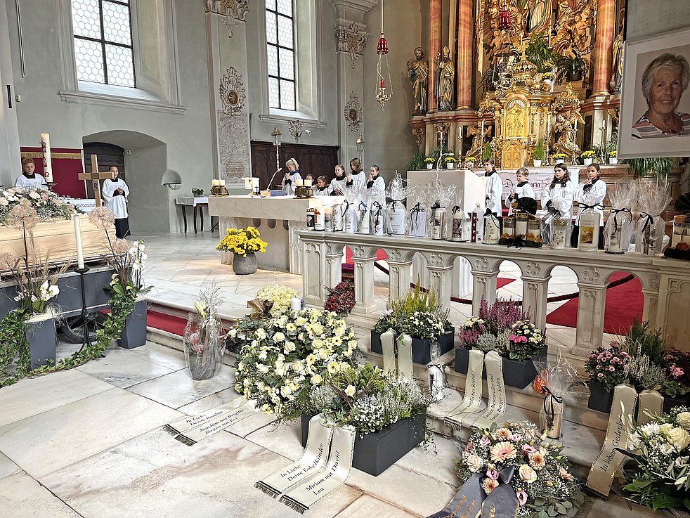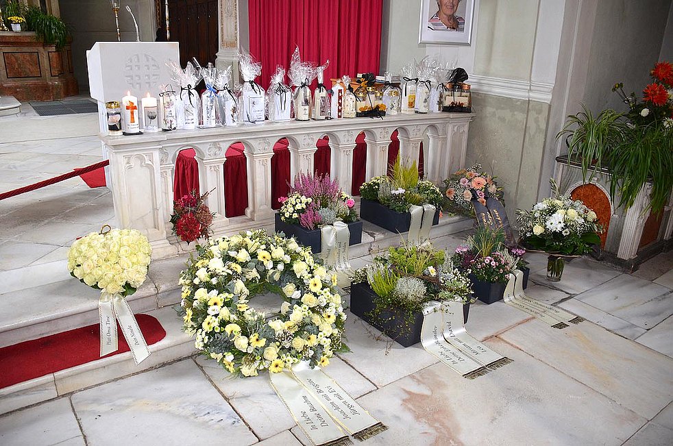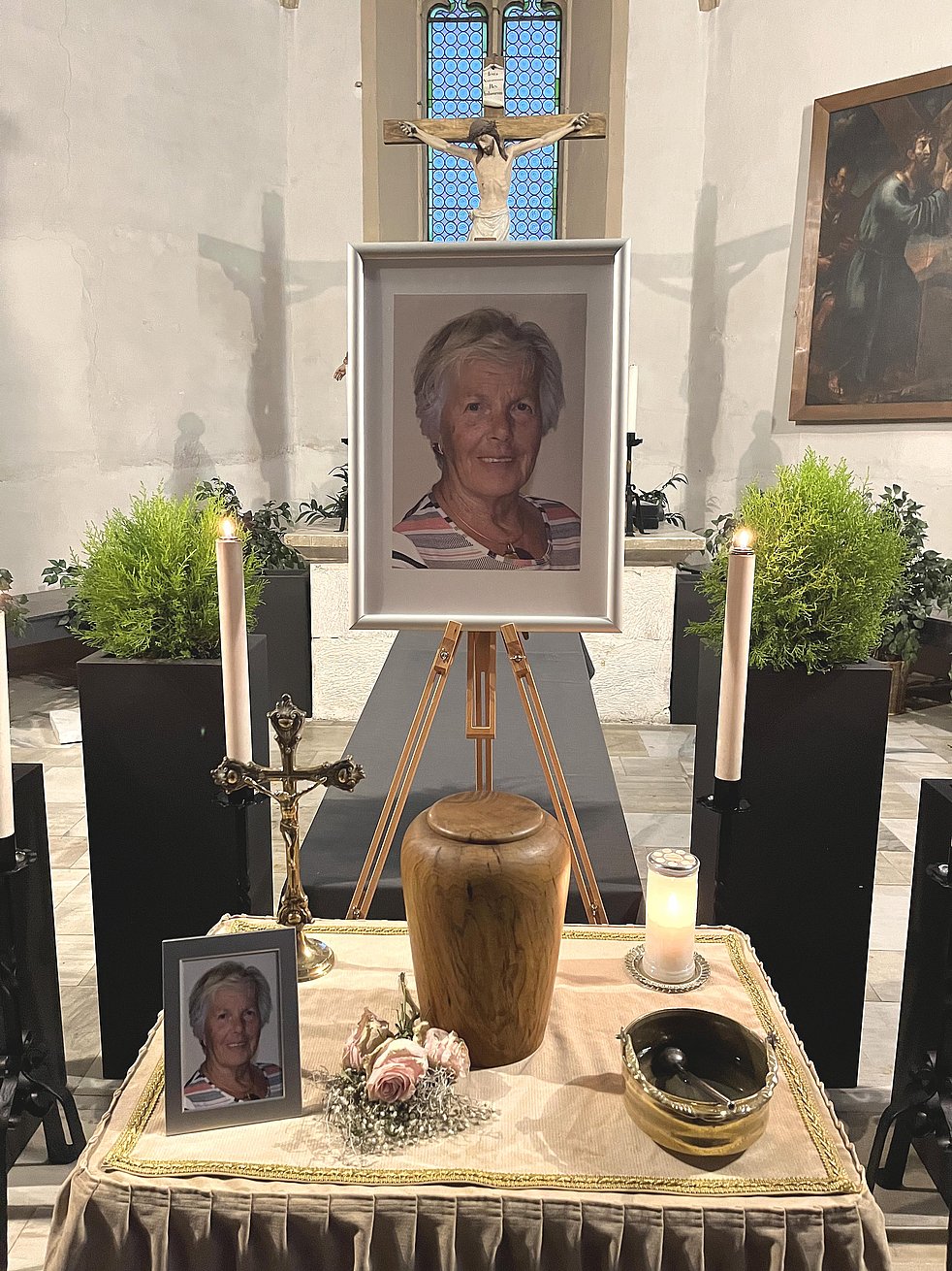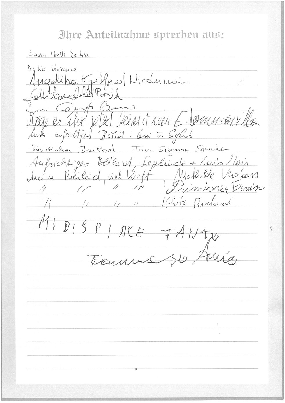 Ich bedaure von Herzen den Verlust Eurer wunderbaren besonderen und liebevollen Gattin und Mamma.Ich kannte Sie nur von Ihren Spaziergängen mit Ihren geliebten Walter,bei denen Sie durch Ihre herzliche und leuchtend Art unsere Welt ein wenig erhellte.Vor kurzen beim bringen der hl.Komunion im Krankenhaus wurde ich reich beschenkt.Es war eine tiefe und bleibende Begegnung in Freude Dankbarkeit und Liebe,man spürte deutlich diese starke Liebe im Zimmer von Ihr und Ihren Walter an der Seite.