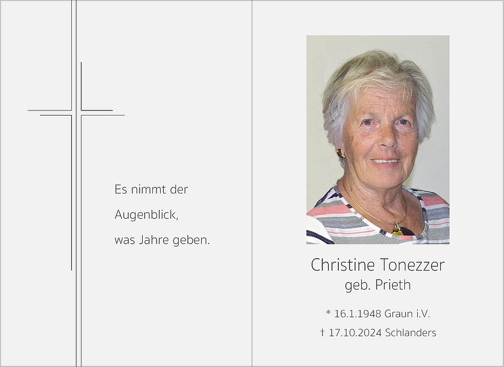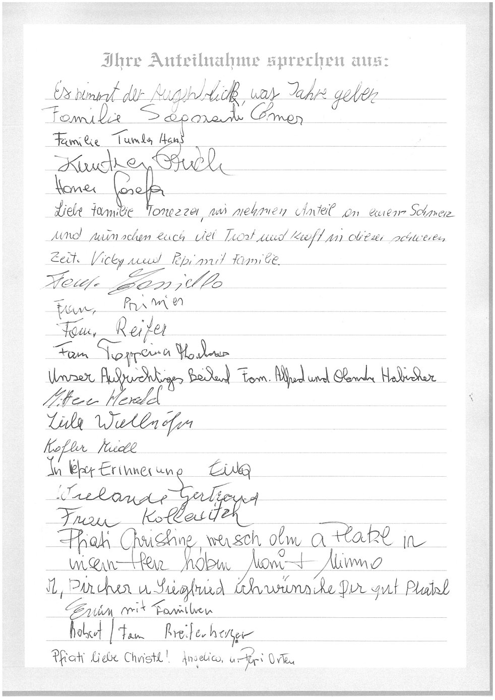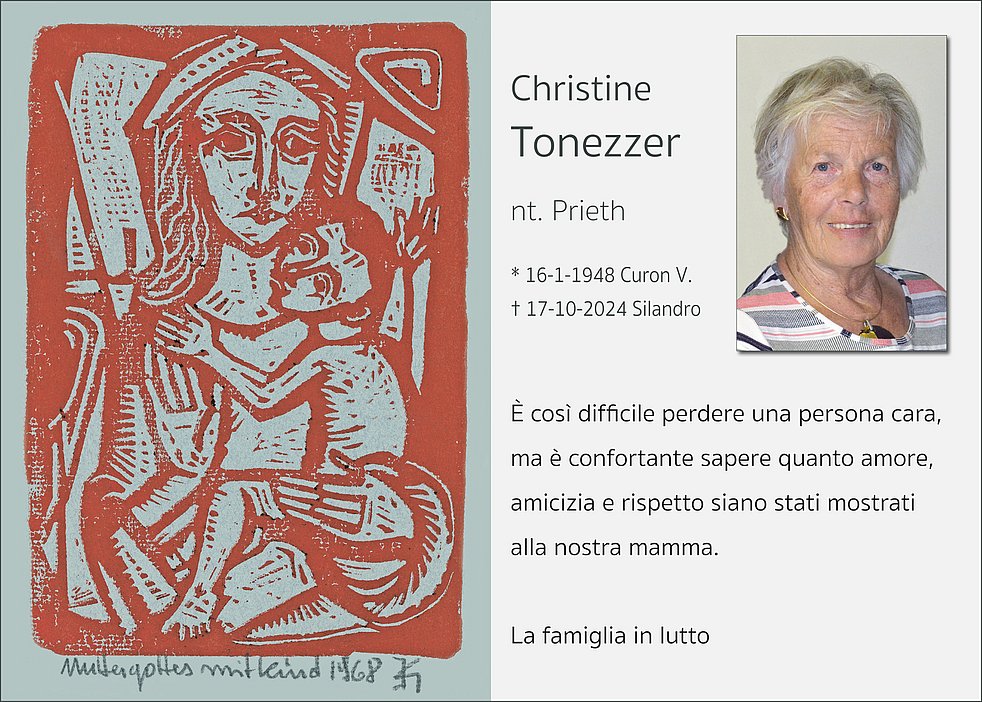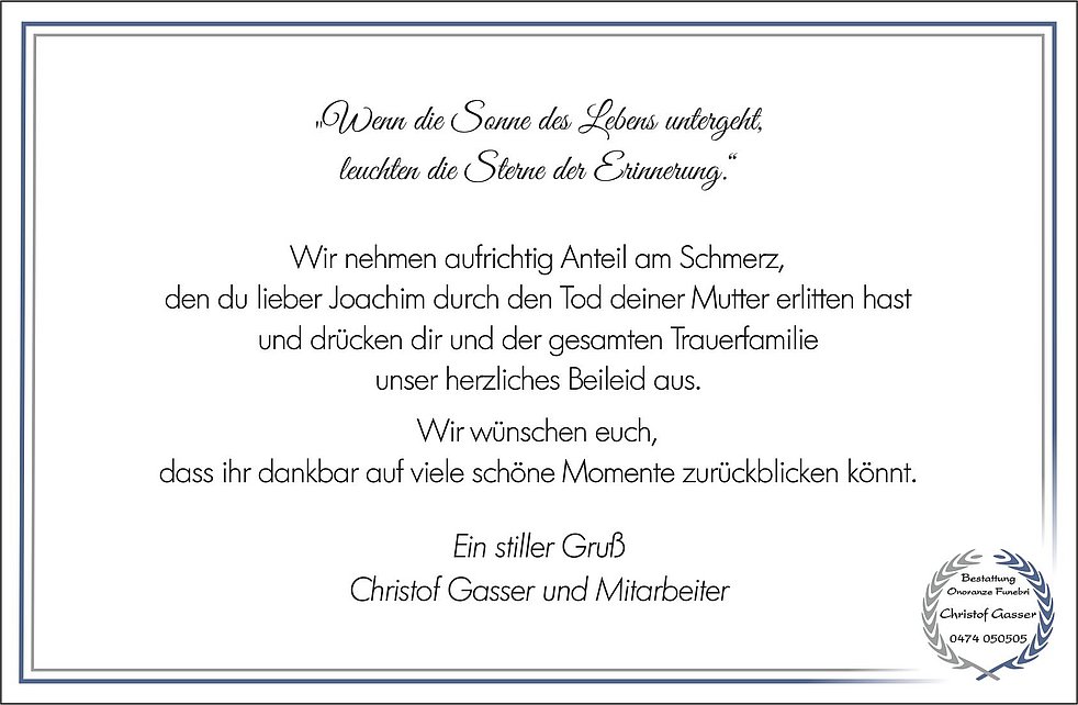 Geschätzte Trauerfamilie Tonezzer, wir drücken euch unser aufrichtiges Mitgefühl und unser herzliches Beileid aus. Mögen Euch die Erinnerung an Eure liebe Frau, Mutter und Oma begleiten wie ein wärmender Sonnenstrahl. Die Lücke, die entsteht, wenn ein Lebenslicht erlischt, läßt sich nicht mehr schließen. Ruhe in Frieden Christl.