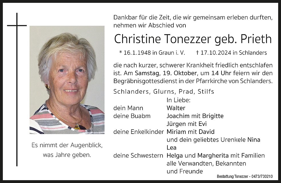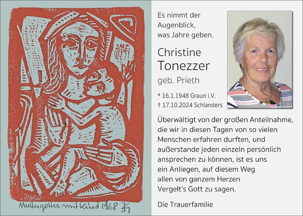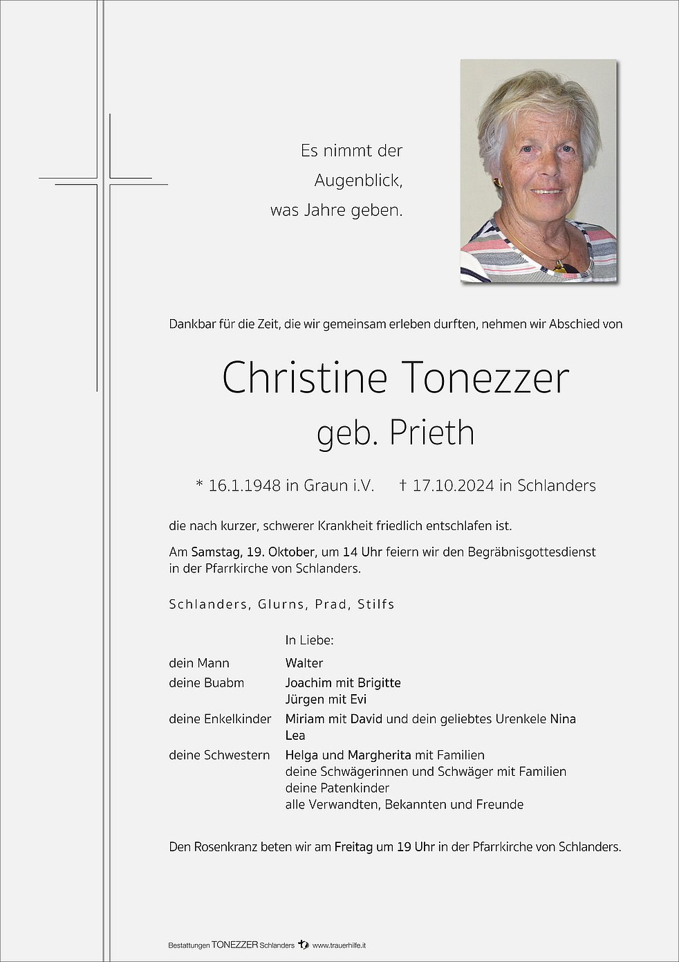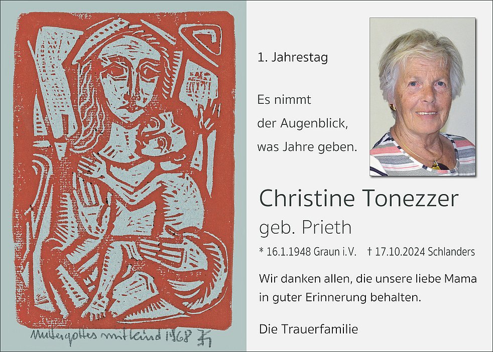 Geschätzte Trauerfamilie Tonezzer, wir drücken euch unser aufrichtiges Mitgefühl und unser herzliches Beileid aus. Mögen Euch die Erinnerung an Eure liebe Frau, Mutter und Oma begleiten wie ein wärmender Sonnenstrahl. Die Lücke, die entsteht, wenn ein Lebenslicht erlischt, läßt sich nicht mehr schließen. Ruhe in Frieden Christl.