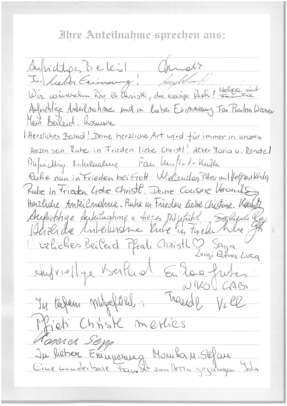 Lieber Walter, lieber Joachim, lieber Jürgen, geschätzte Trauerfamilien, wir reichen euch die Hand zum stillen Gruß und drücken euch unser inniges, sowie tief empfundenes, Mitgefühl am Verlust eurer geliebten Christine aus. Wir wünschen euch Kraft, Liebe und Geborgenheit, aber auch Zuversicht in dieser schweren und unfassbaren Zeit.