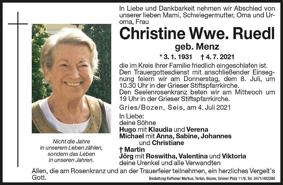 Den Trauergottesdienst mit anschließender Einsegnung feiern wir am Donnerstag, dem 8. Juli, um 10.30 Uhr in der Grieser Stiftspfarrkirche.
