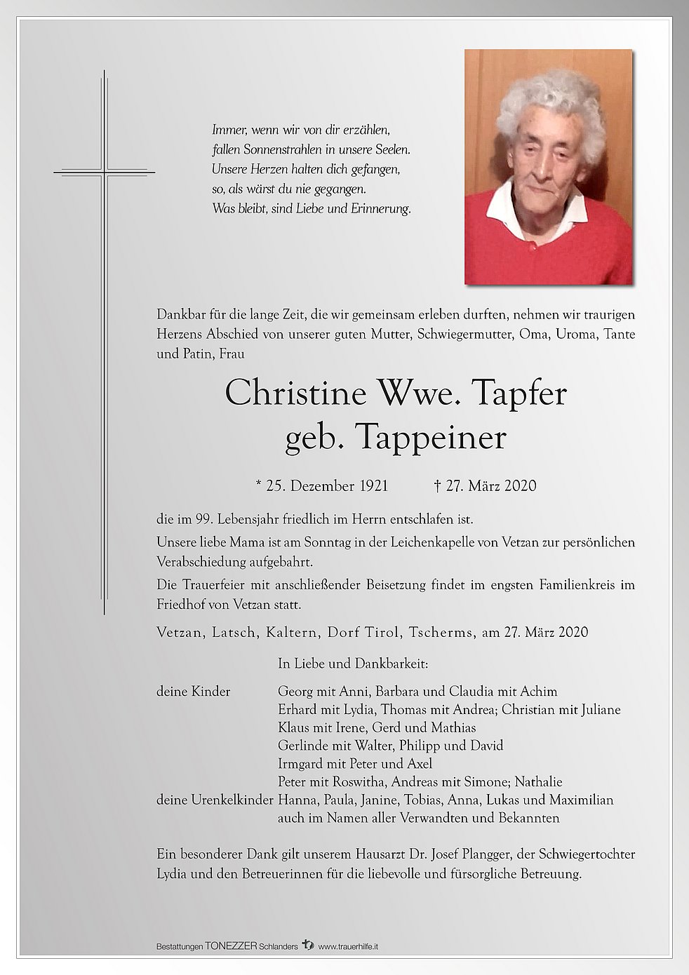 Ein besonderer Dank gilt unserem Hausarzt Dr. Josef Plangger, der Schwiegertochter Lydia und den Betreuerinnen für die liebevolle und fürsorgliche Betreuung.