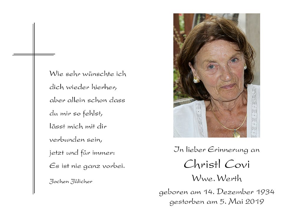 Den Trauergottesdienst feiern wir am Mittwoch, dem 8. Mai um 14.30 Uhr in der Pfarrkirche von St. Michael/Eppan. Anschließend begleiten wir unsere liebe Verstorbene auf den Ortsfriedhof.