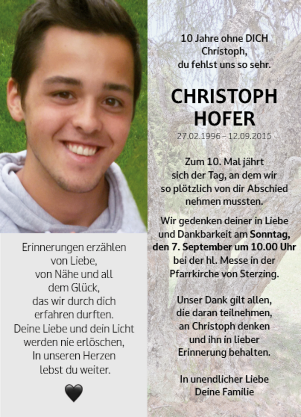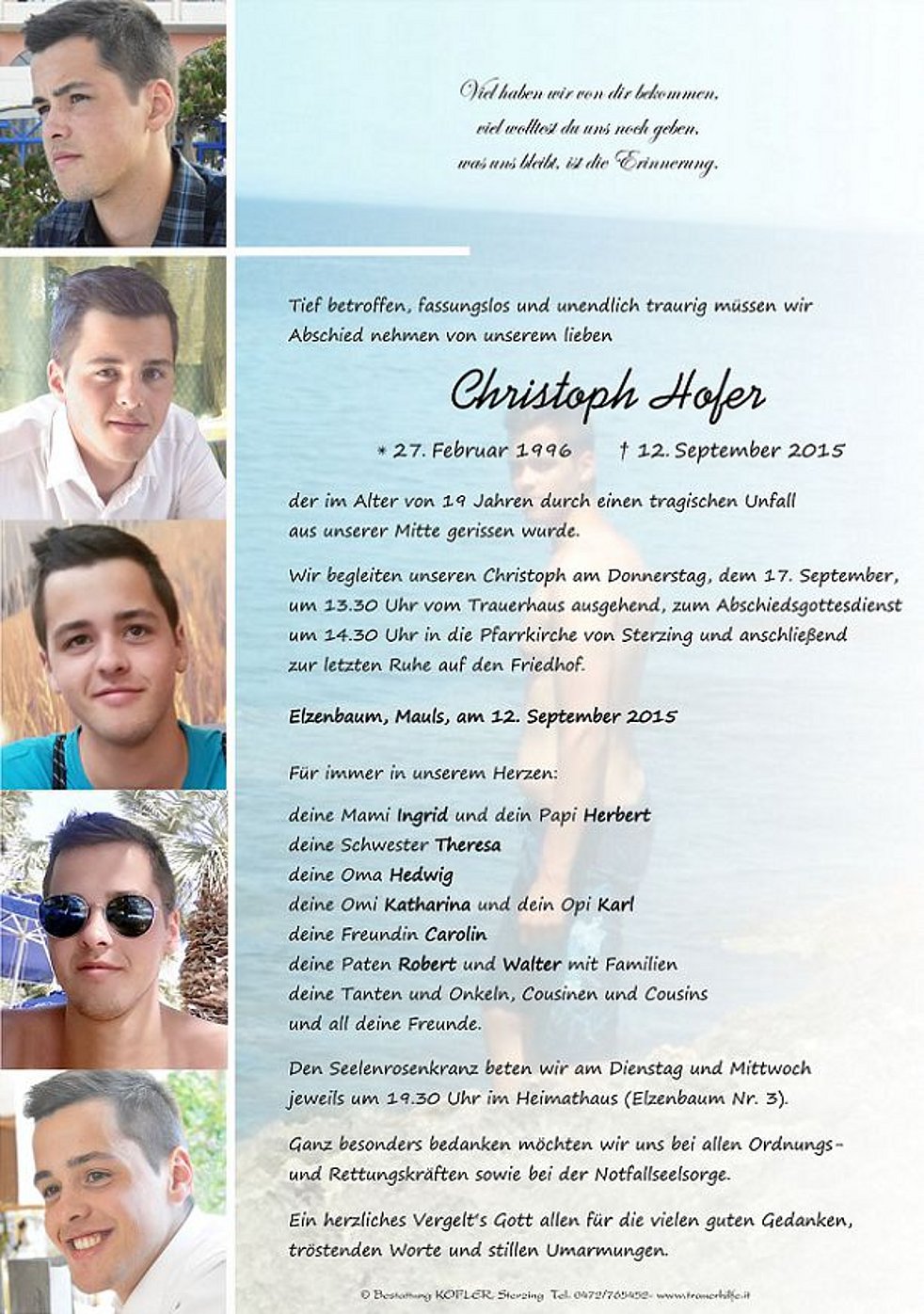 Viel haben wir von dir bekommen, viel wolltest du uns noch geben, was uns bleibt, ist die Erinnerung. Tief betroffen, fassungslos und unendlich traurig müssen wir Abschied nehmen von unserem lieben Christoph Hofer * 27. Februar 1996 † 12. September 2015 der im Alter von 19 Jahren durch einen tragischen Unfall aus unserer Mitte gerissen wurde. Wir begleiten unseren Christoph am Donnerstag, dem 17. September, um 13.30 Uhr vom Trauerhaus ausgehend, zum Abschiedsgottesdienst um 14.30 Uhr in die Pfarrkirche von Sterzing und anschließend zur letzten Ruhe auf den Friedhof. Elzenbaum, Mauls, am 12. September 2015 Für immer in unserem Herzen: deine Mami Ingrid und dein Papi Herbert deine Schwester Theresa deine Oma Hedwig deine Omi Katharina und dein Opi Karl deine Freundin Carolin deine Paten Robert und Walter mit Familien deine Tanten und Onkeln, Cousinen und Cousins und all deine Freunde. Den Seelenrosenkranz beten wir am Dienstag und Mittwoch jeweils um 19.30 Uhr im Heimathaus (Elzenbaum Nr. 3). Ganz besonders bedanken möchten wir uns bei allen Ordnungs- und Rettungskräften sowie bei der Notfallseelsorge. Ein herzliches Vergelt‘s Gott allen für die vielen guten Gedanken, tröstenden Worte und stillen Umarmungen.