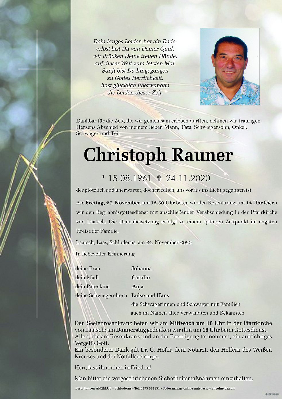 Am Freitag, 27. November, um 13.30 Uhr beten wir den Rosenkranz; um 14 Uhr feiern wir den Begräbnisgottesdienst mit anschließender Verabschiedung in der Pfarrkirche von Laatsch. Die Urnenbeisetzung erfolgt zu einem späteren Zeitpunkt im engsten Kreise der Familie.