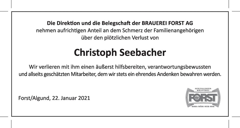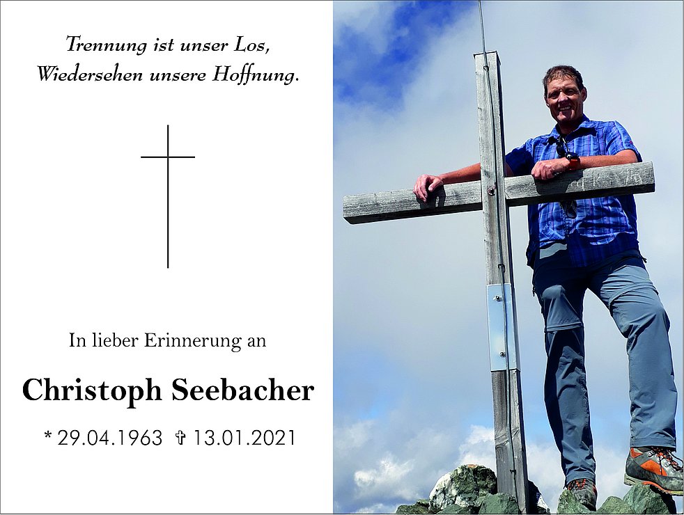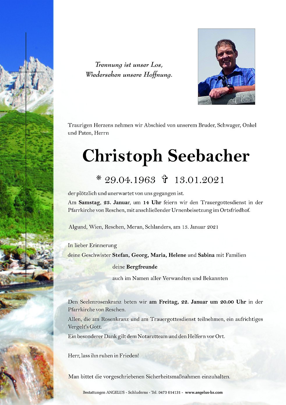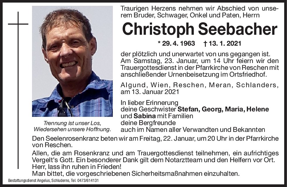 Am Samstag, 23. Januar, um 14 Uhr feiern wir den Trauergottesdienst in der Pfarrkirche von Reschen, mit anschließender Urnenbeisetzung im Ortsfriedhof.