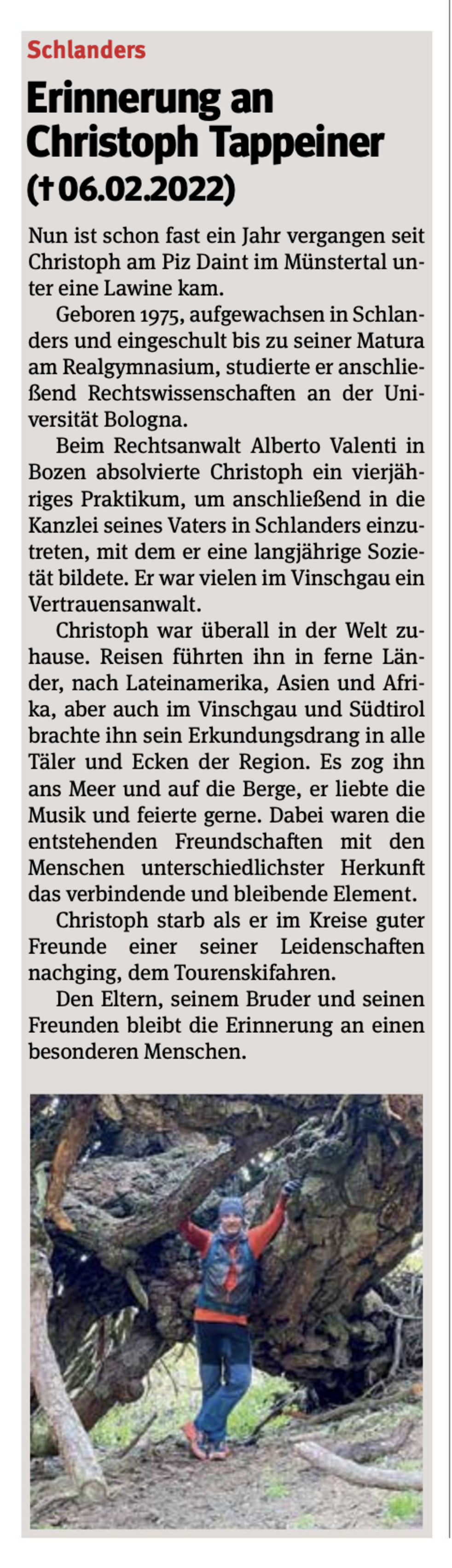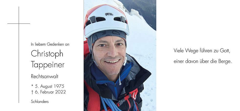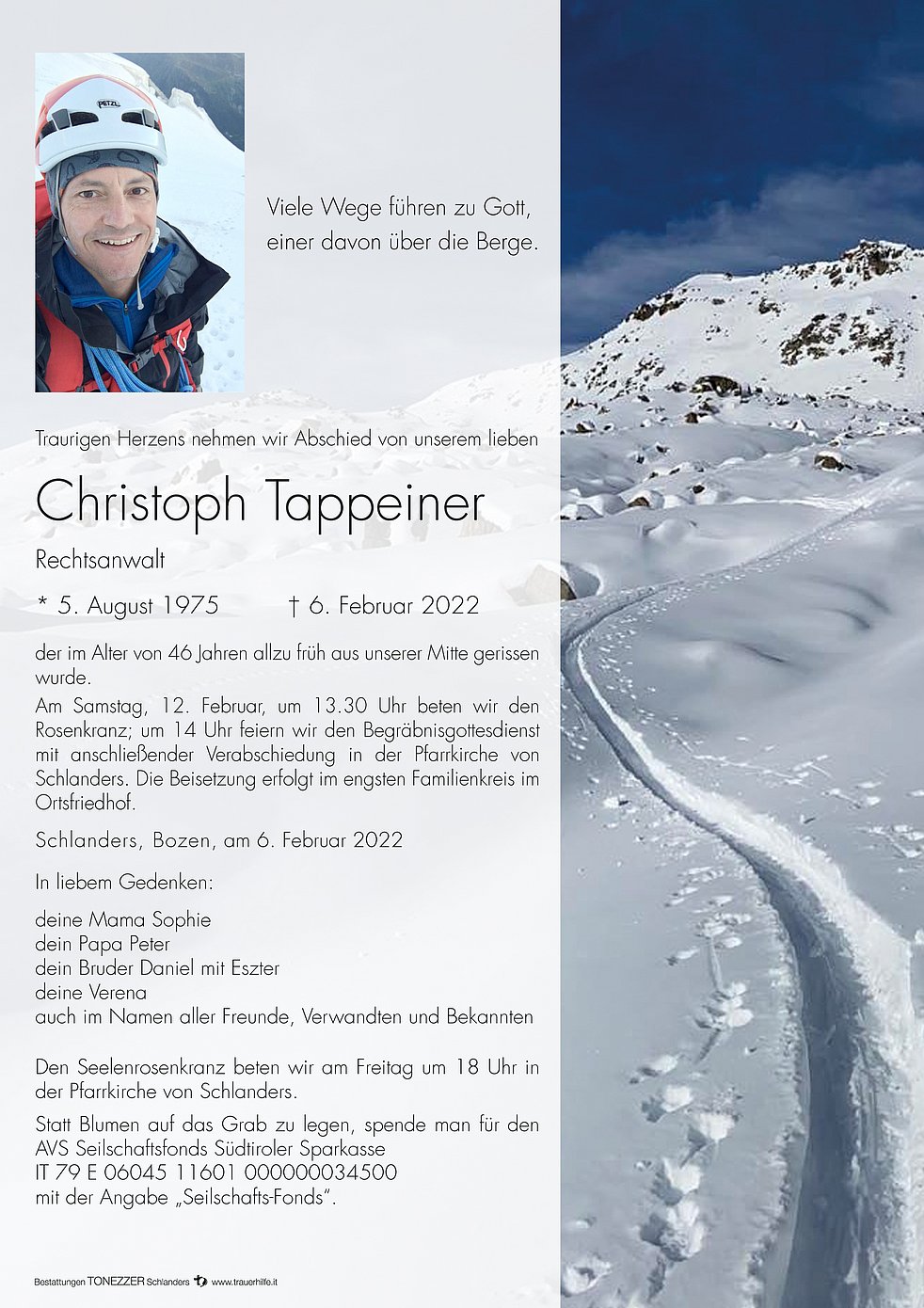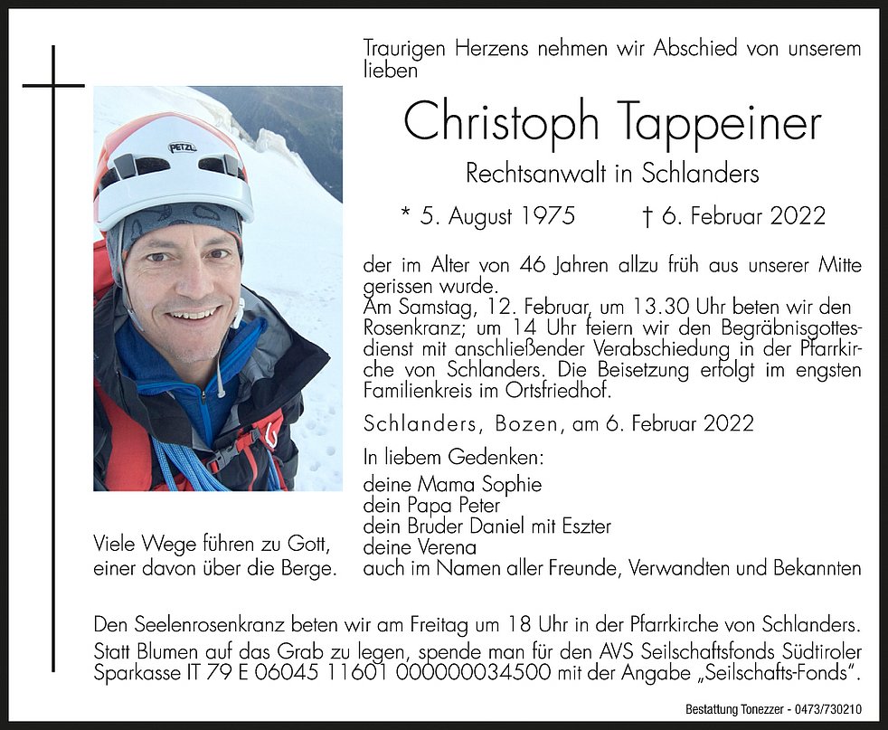 Statt Blumen auf das Grab zu legen, spende man für den AVS Seilschaftsfonds Südtiroler Sparkasse IT 79 E 06045 11601 000000034500 mit der Angabe „Seilschafts-Fonds“.