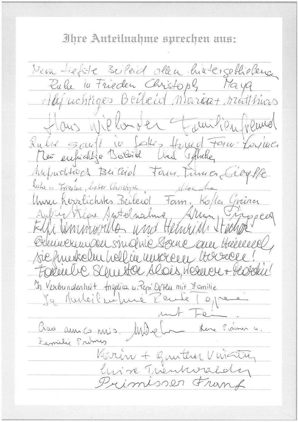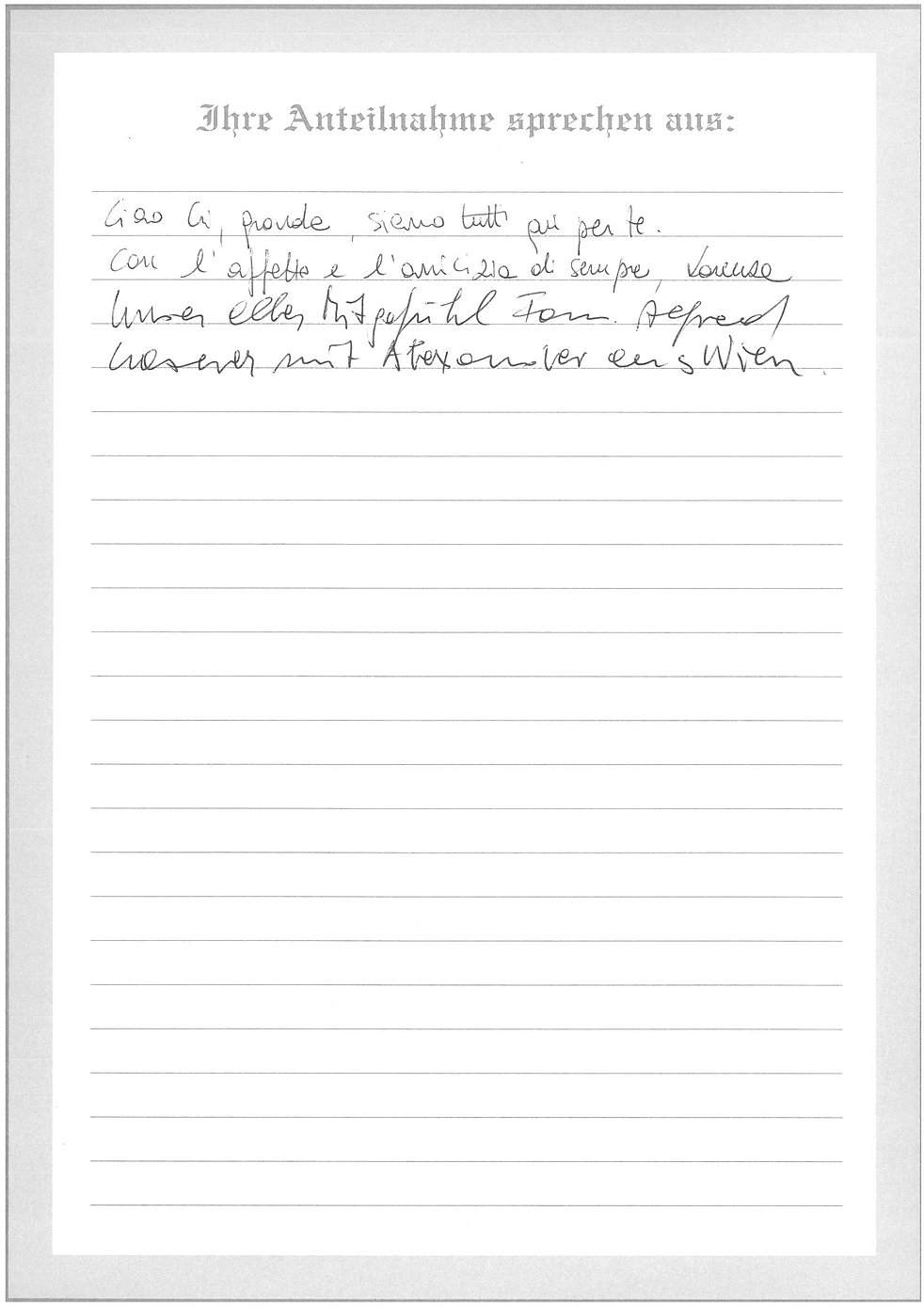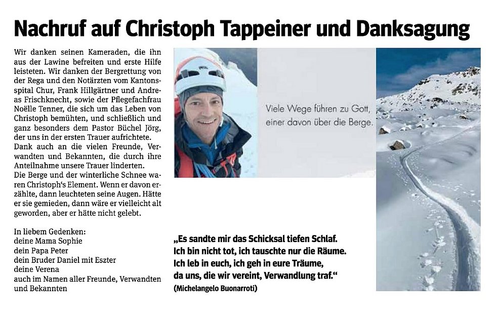 Statt Blumen auf das Grab zu legen, spende man für den AVS Seilschaftsfonds Südtiroler Sparkasse IT 79 E 06045 11601 000000034500 mit der Angabe „Seilschafts-Fonds“.