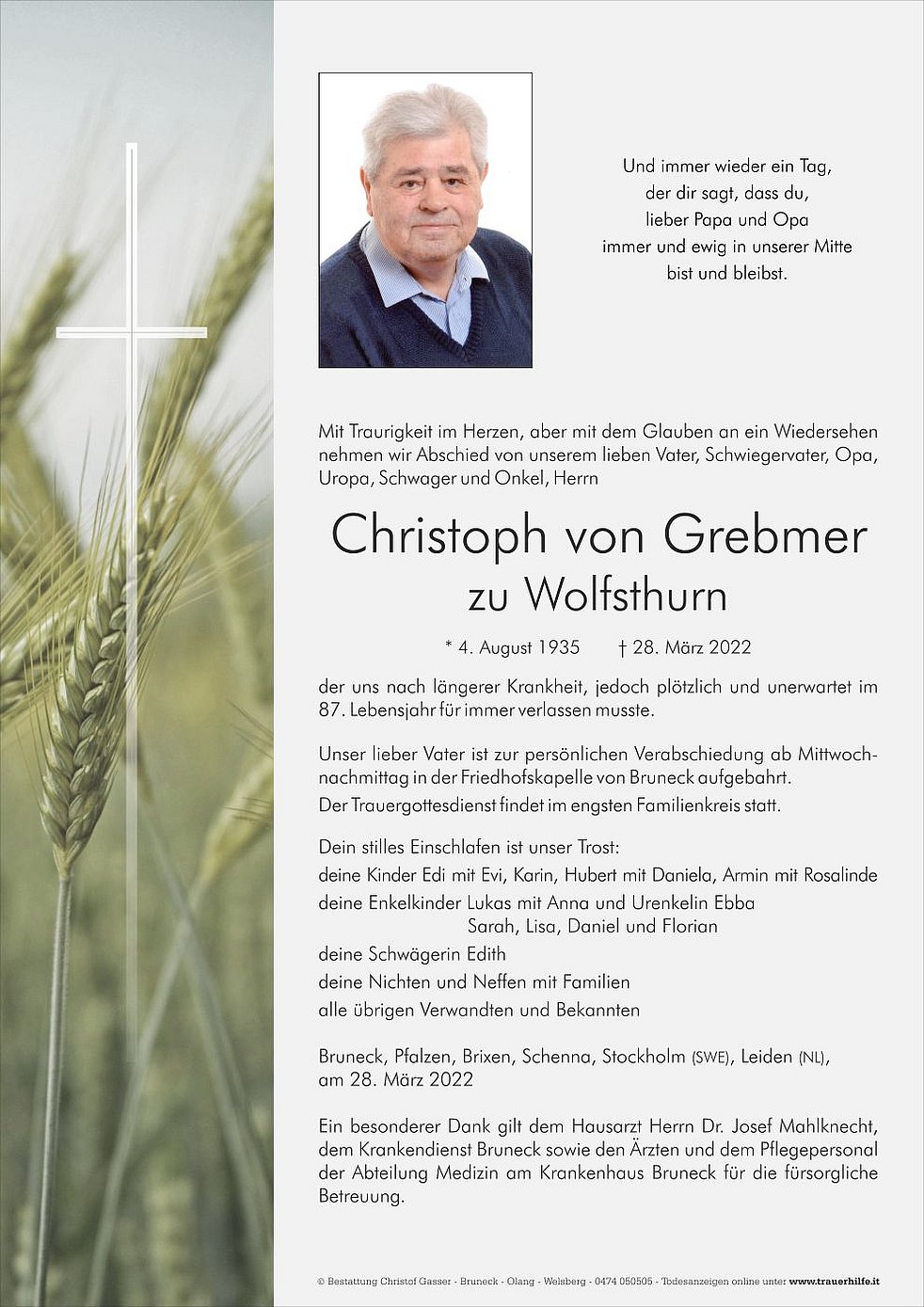 Unser lieber Vater ist zur persönlichen Verabschiedung ab Mittwochnachmittag in der Friedhofskapelle von Bruneck aufgebahrt.