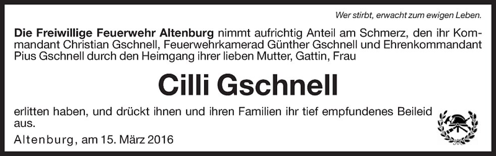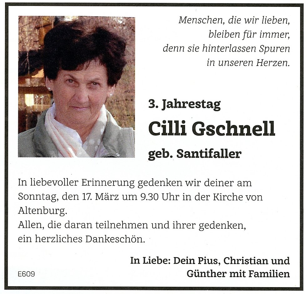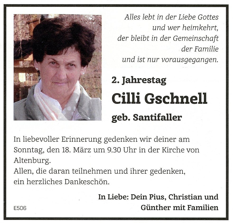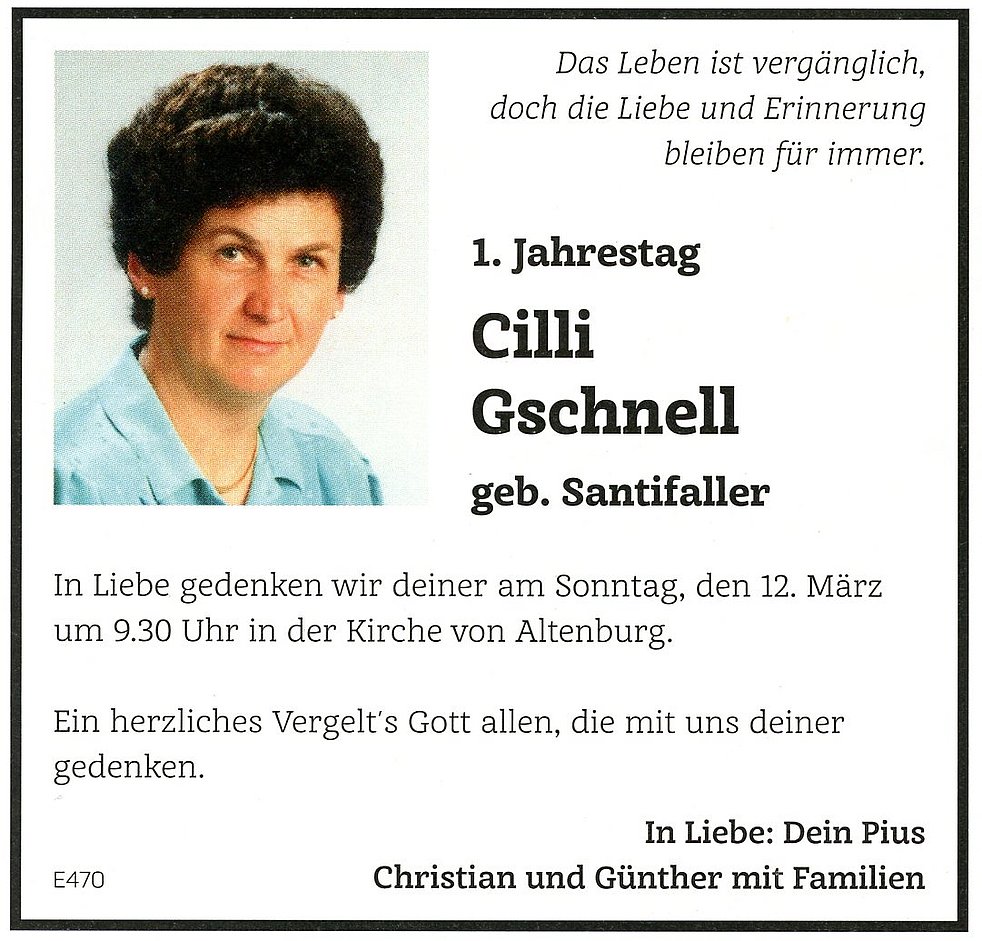 Wir begleiten unsere liebe Verstorbene, von der Marienkapelle ausgehend, zum Trauergottesdienst am Freitag, den 18. März um 14.30 Uhr in der Kirche in Altenburg. Anschließend verabschieden wir unsere liebe Cilli auf dem Kirchplatz und setzen sie im Ortsfriedhof bei.