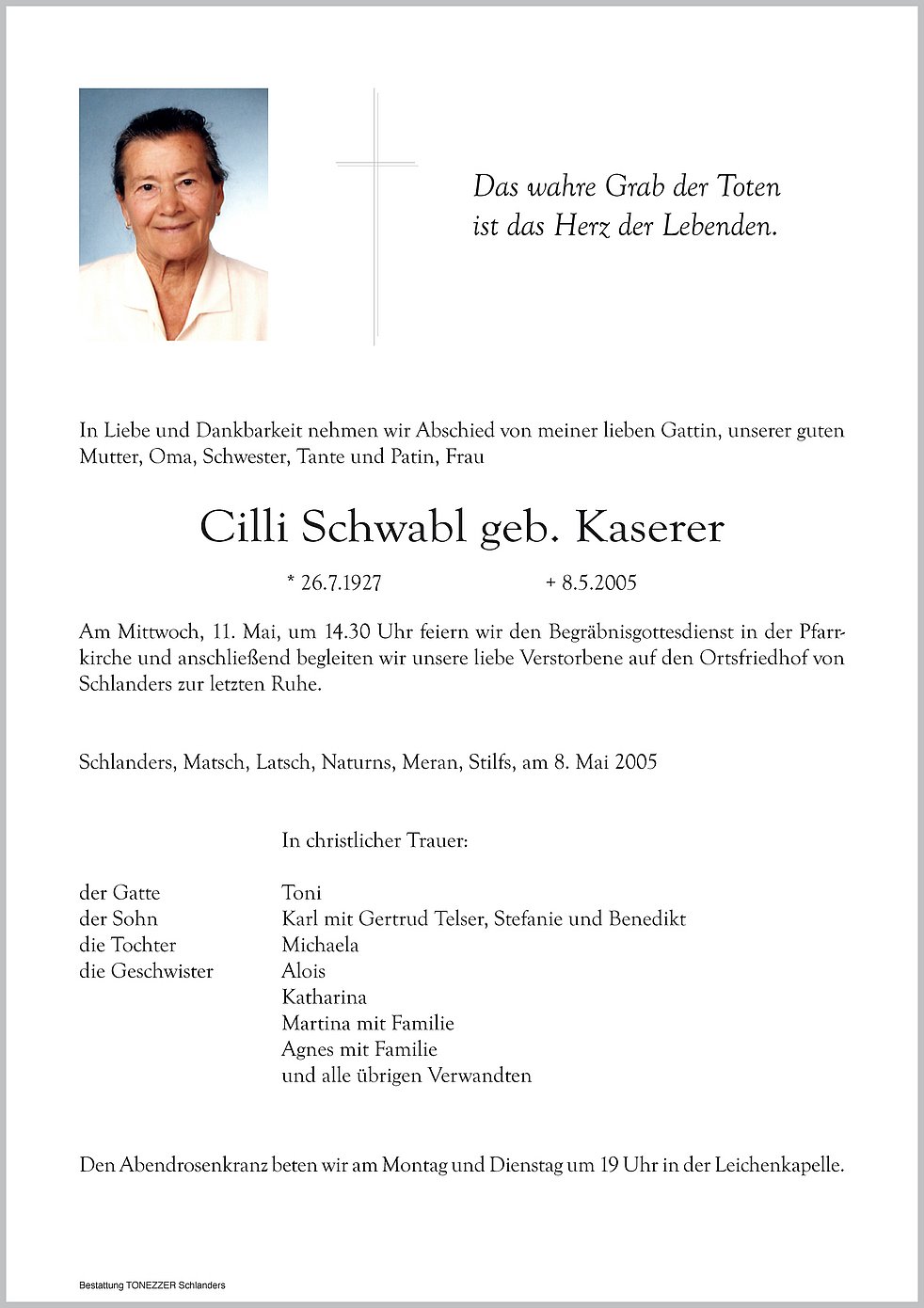 Am Mittwoch, 11. Mai, um 14.30 Uhr feiern wir den Begräbnisgottesdienst in der Pfarrkirche und anschließend begleiten wir unsere liebe Verstorbene auf den Ortsfriedhof von Schlanders zur letzten Ruhe.