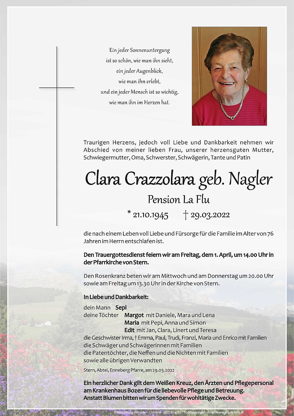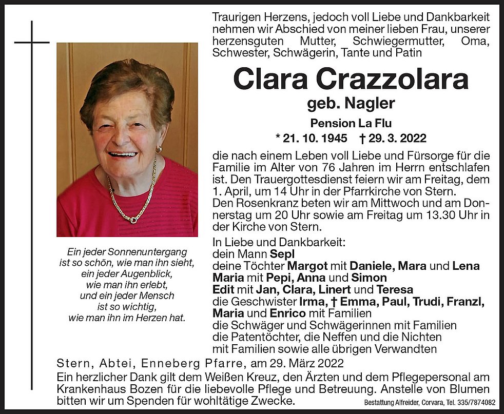 Den Trauergottesdienst feiern wir am Freitag, dem 1. April, um 14.00 Uhr in der Pfarrkirche von Stern.