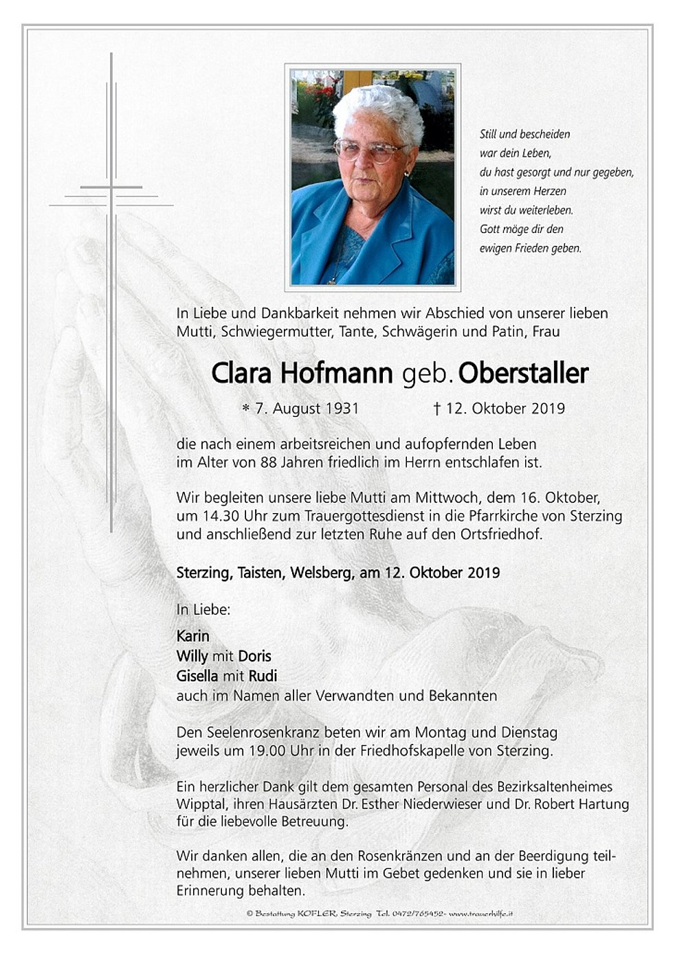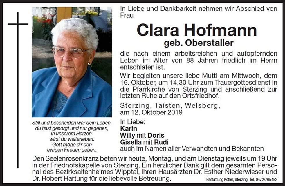 Wir begleiten unsere liebe Mutti am Mittwoch, dem 16. Oktober, um 14.30 Uhr zum Trauergottesdienst in die Pfarrkirche von Sterzing und anschließend zur letzten Ruhe auf den Ortsfriedhof.