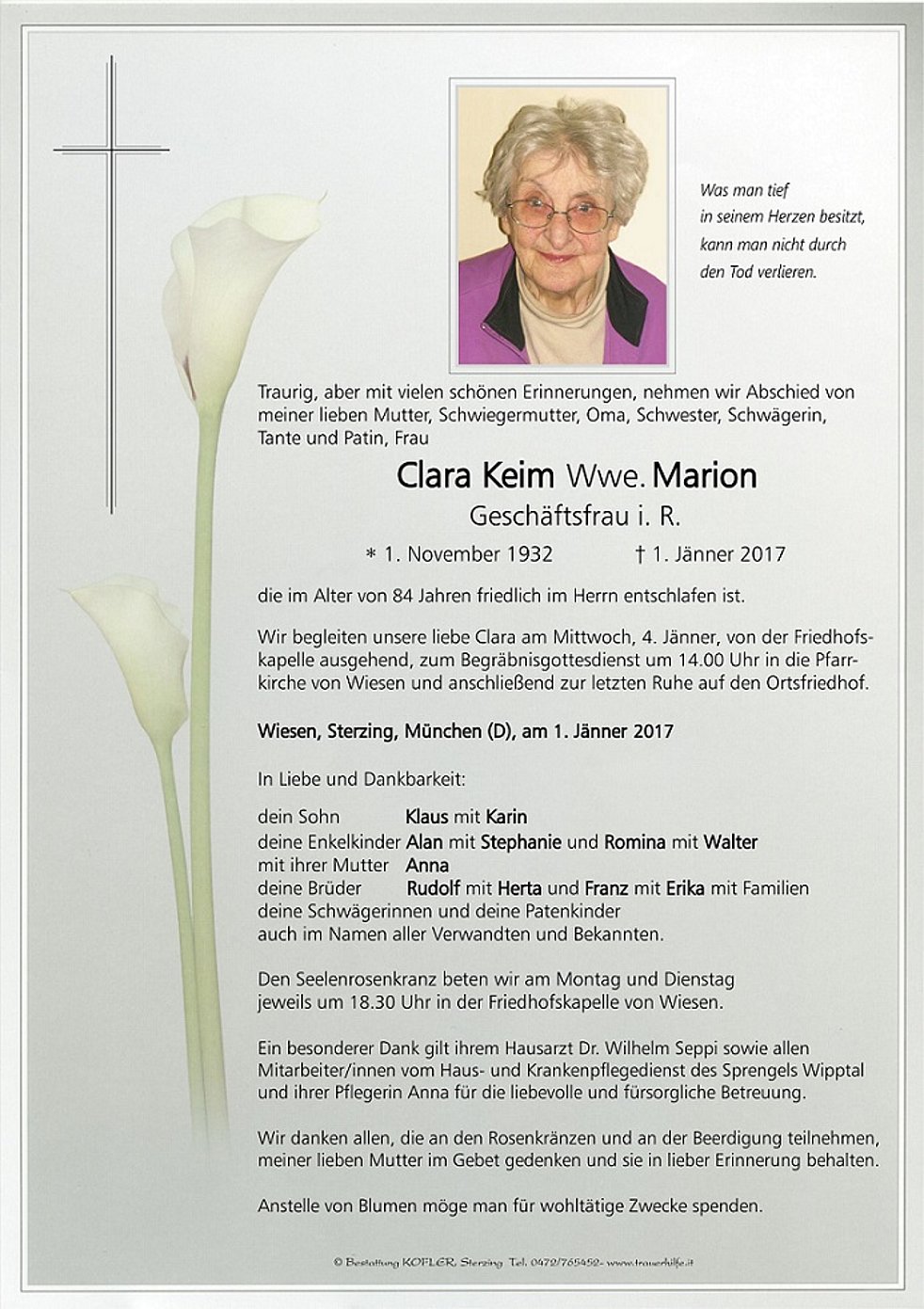 Ein besonderer Dank gilt ihrem Hausarzt Dr. Wilhelm Seppi sowie allen Mitarbeiter/ innen vom Haus- und Krankenpflegedienst des Sprengels Wipptal und ihrer Pflegerin Anna für die liebevolle und fürsorgliche Betreuung.