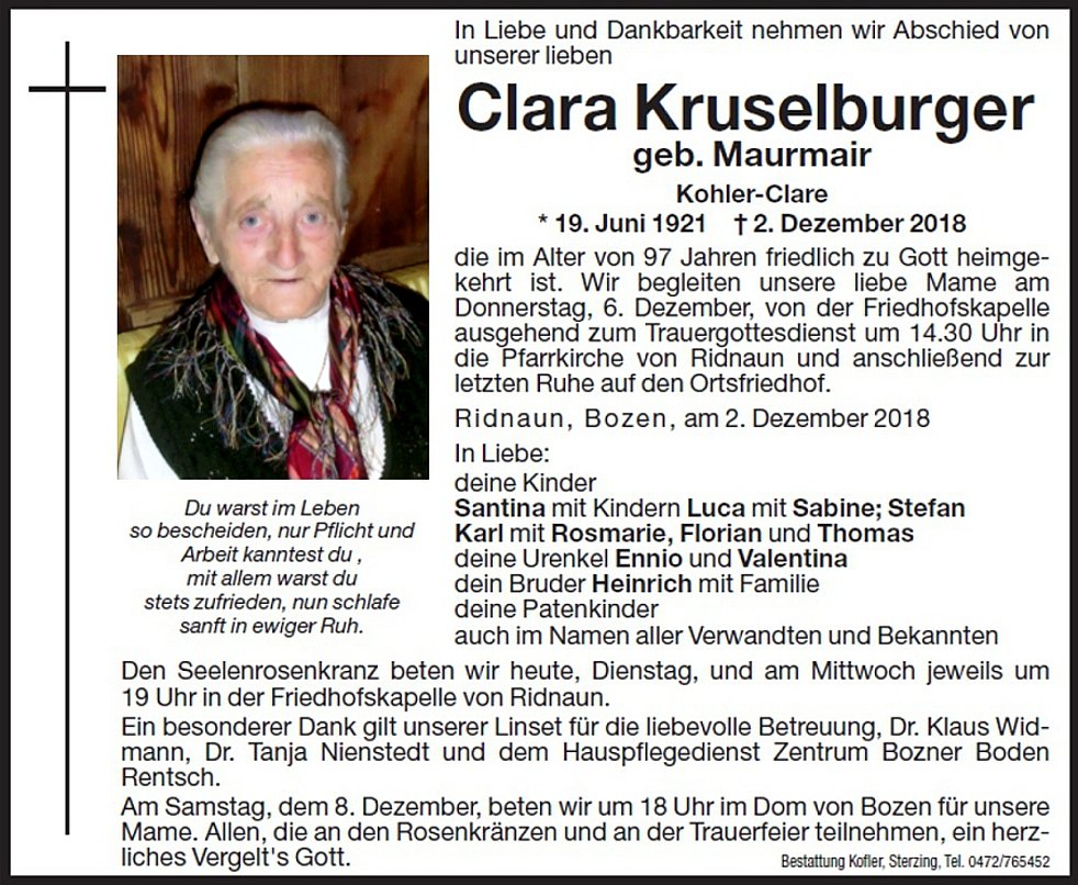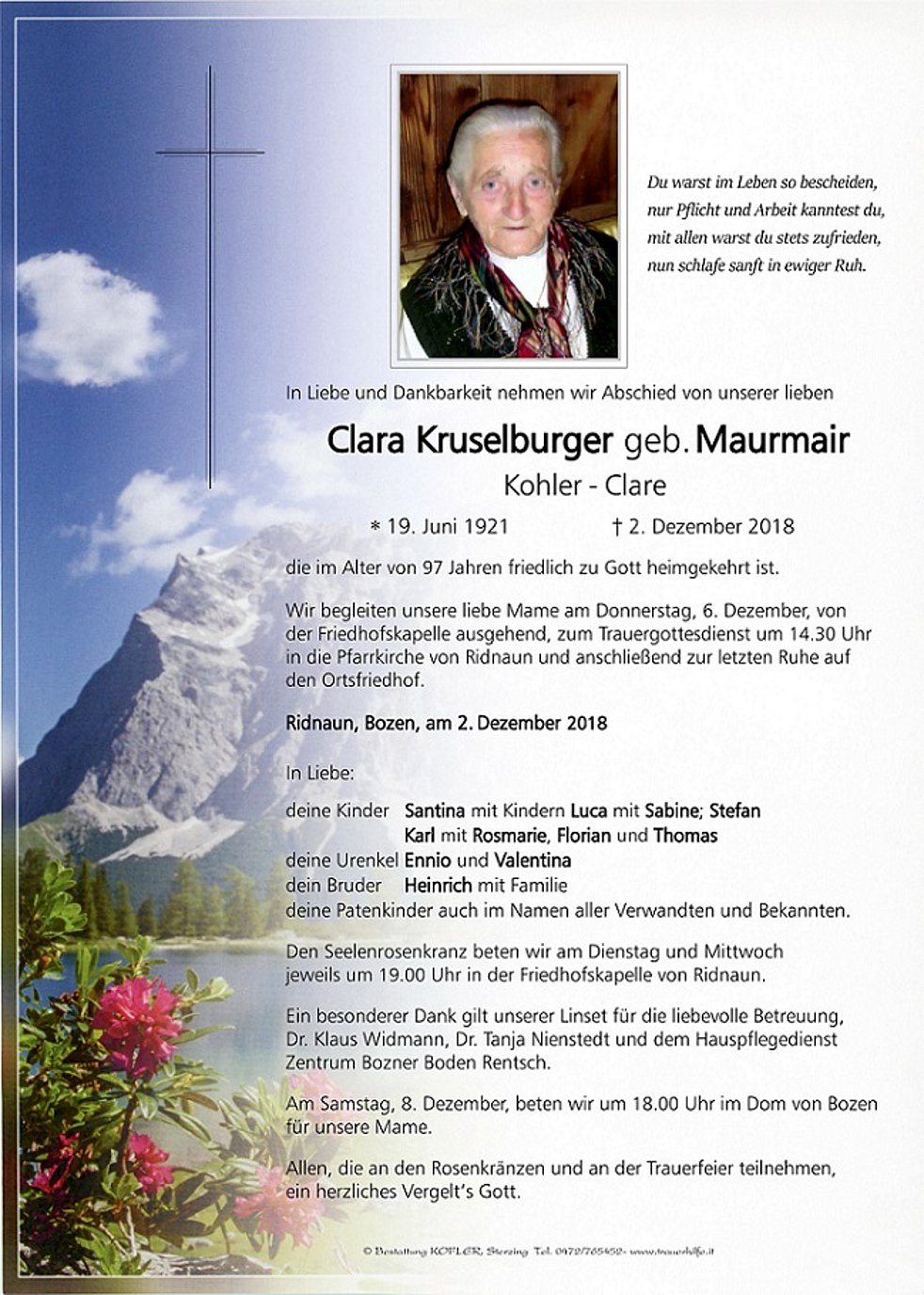 Wir begleiten unsere liebe Mame am Donnerstag, 6. Dezember, von der Friedhofskapelle ausgehend, zum Trauergottesdienst um 14.30 Uhr in die Pfarrkirche von Ridnaun und anschließend zur letzten Ruhe auf den Ortsfriedhof.
