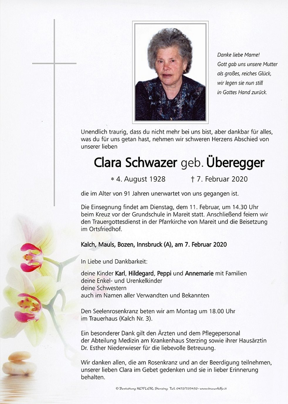 Ein besonderer Dank gilt den Ärzten und dem Pflegepersonal der Abteilung Medizin am Krankenhaus Sterzing sowie ihrer Hausärztin Dr. Esther Niederwieser für die liebevolle Betreuung.
