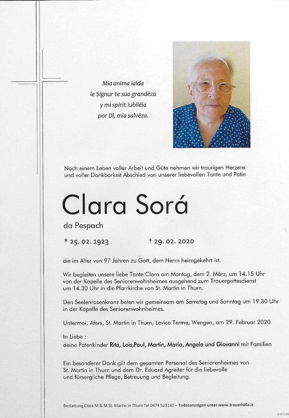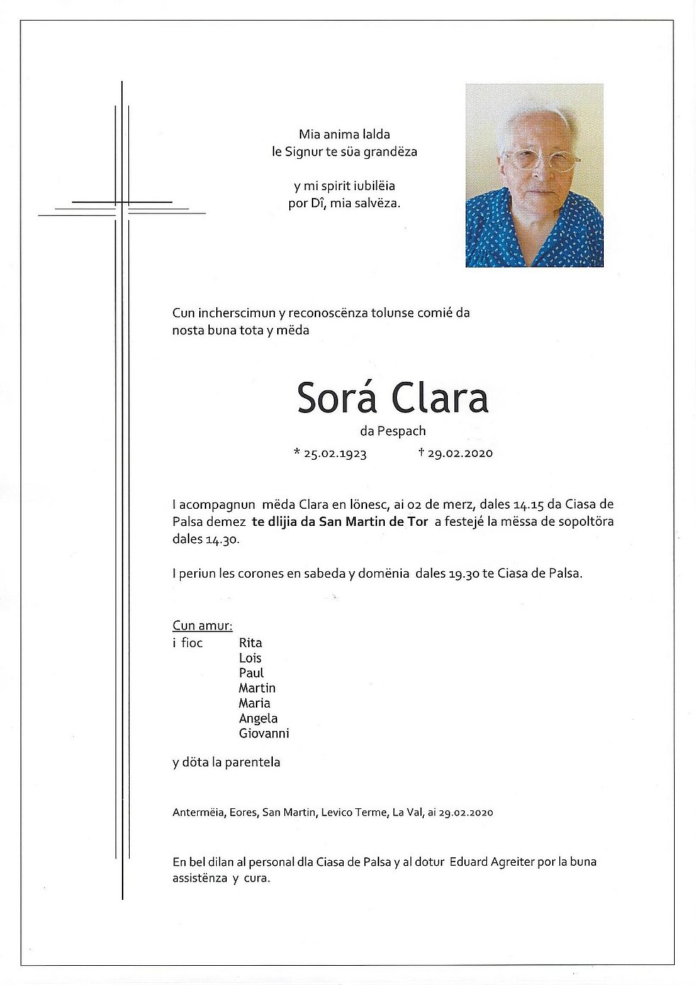 Wir begleiten unsere liebe Tante Clara am Montag, dem 2. März, um 14.15 Uhr von der Kapelle des Seniorenwohnheimes ausgehend zum Trauergottesdienst um 14.30 Uhr in die Pfarrkirche von St. Martin in Thurn.