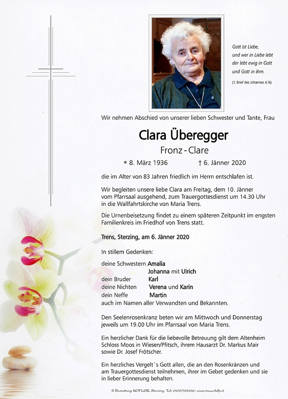 Wir begleiten unsere liebe Clara am Freitag, dem 10. Jänner vom Pfarrsaal ausgehend, zum Trauergottesdienst um 14.30 Uhr in die Wallfahrtskirche von Maria Trens.