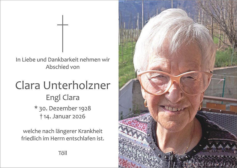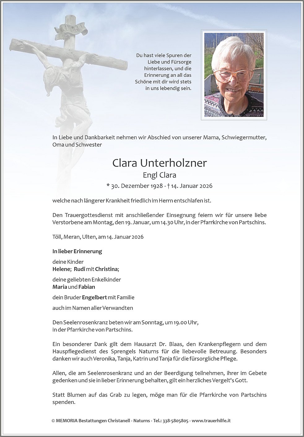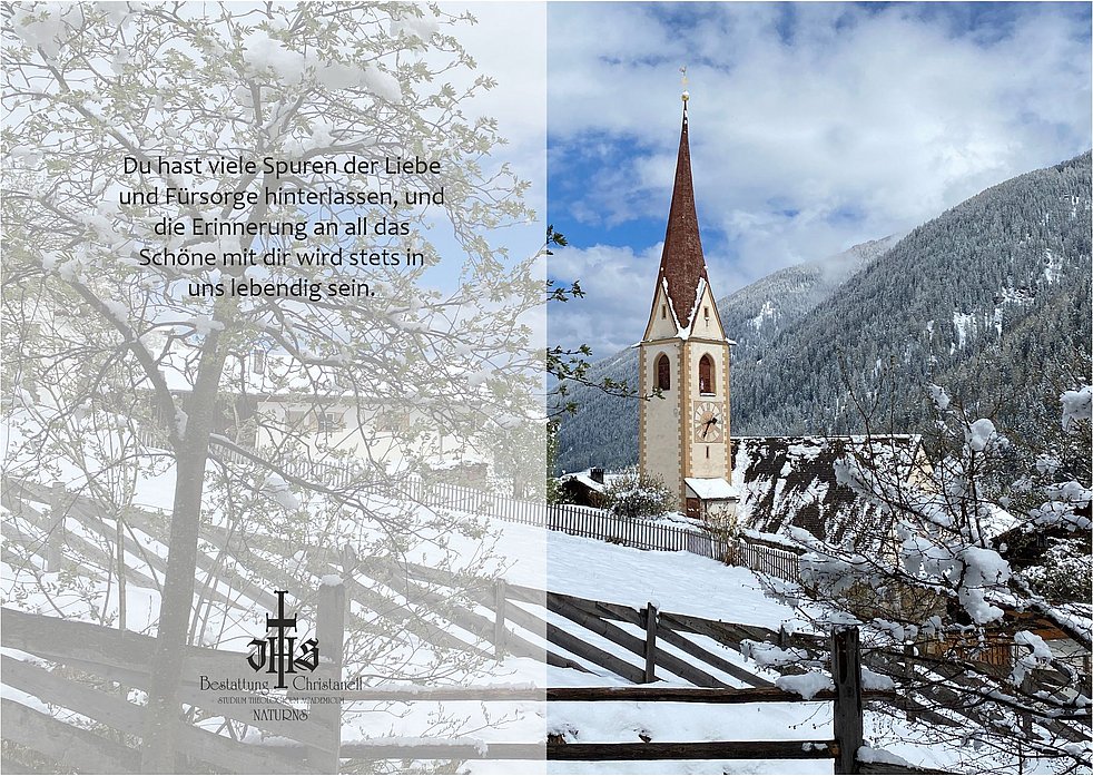 Den Trauergottesdienst mit anschließender Einsegnung feiern wir für unsere liebe Verstorbene am Montag, den 19. Januar, um 14.30 Uhr, in der Pfarrkirche von Partschins.