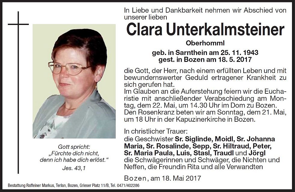 Im Glauben an die Auferstehung feiern wir die Eucharistie mit anschließender Verabschiedung am Montag, dem 22. Mai, um 14.30 Uhr im Dom zu Bozen.
