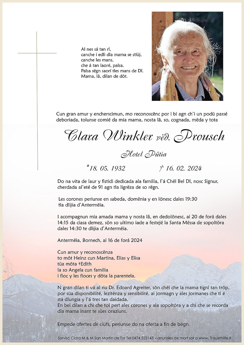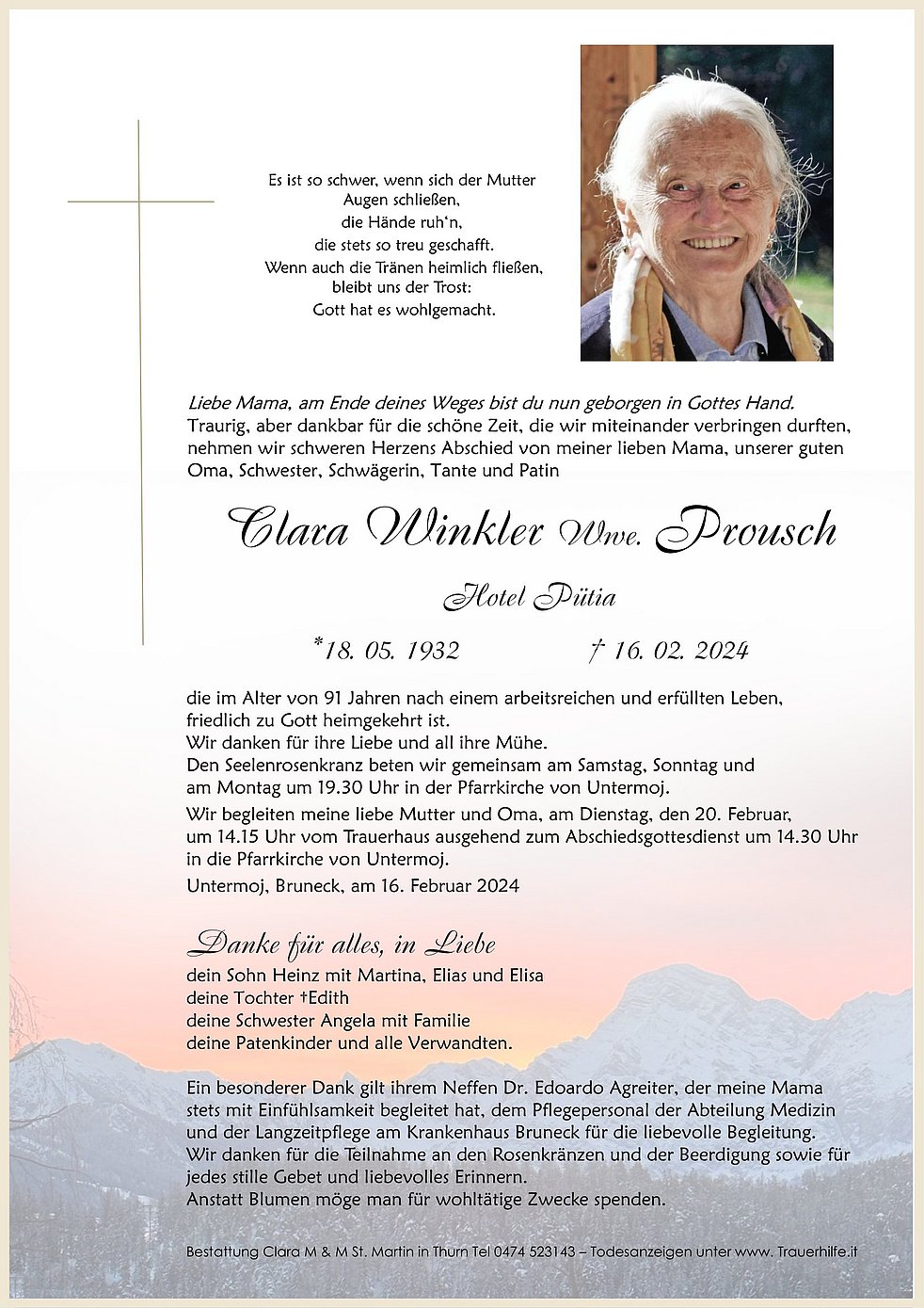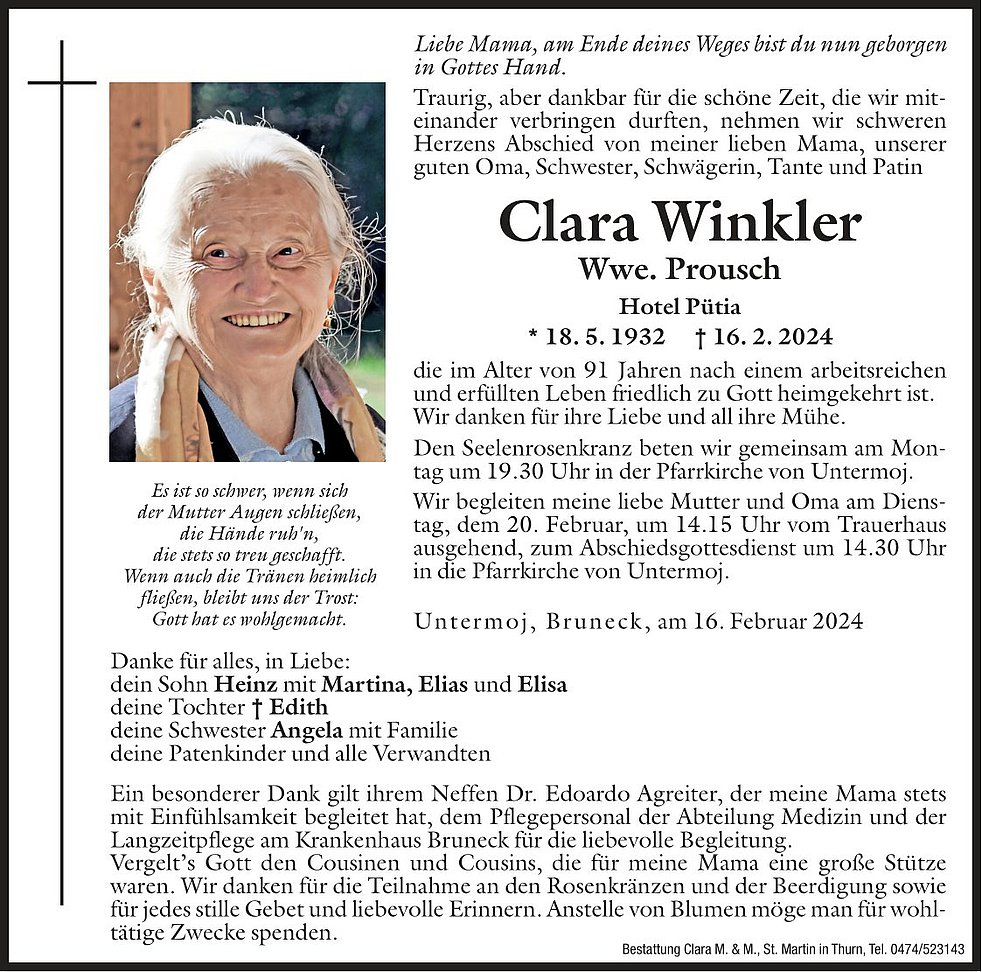 Jeder folgt in seinem Leben eine Straße,keiner weiß wann und wo sie endet,aber alle hinterlassen Spuren und manche kreuzen auch unseren Weg.Liebe Frau Winkler ruhen sie sanft in Gotteshand.Der Trauerfamilie herzliches Beileid vom gesamten Team der Langzeitpflege
