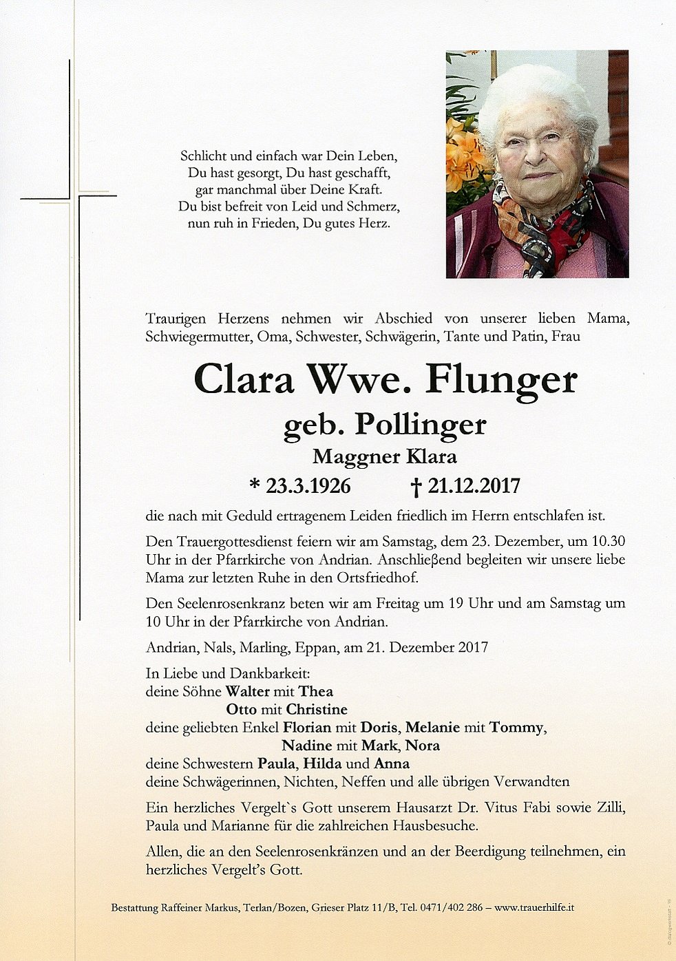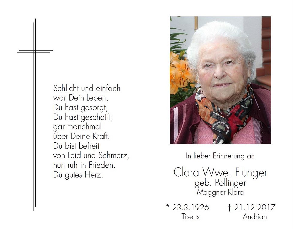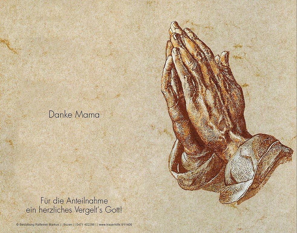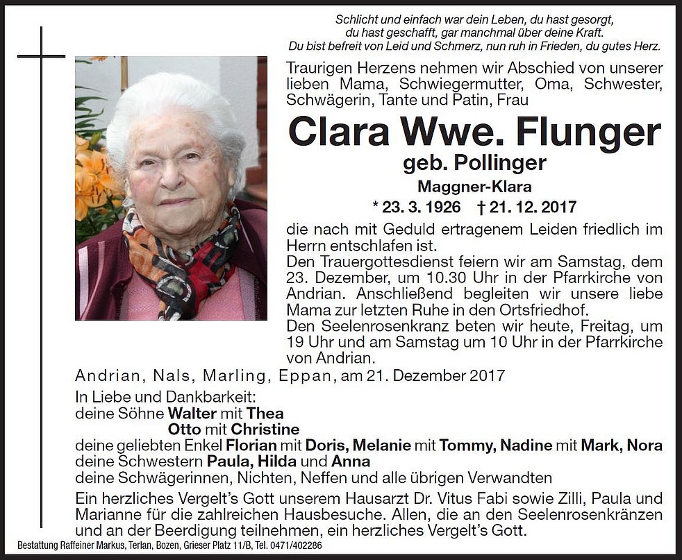 Den Trauergottesdienst feiern wir am Samstag, dem 23. Dezember, um 10.30 Uhr in der Pfarrkirche von Andrian. Anschlieβend begleiten wir unsere liebe Mama zur letzten Ruhe in den Ortsfriedhof.