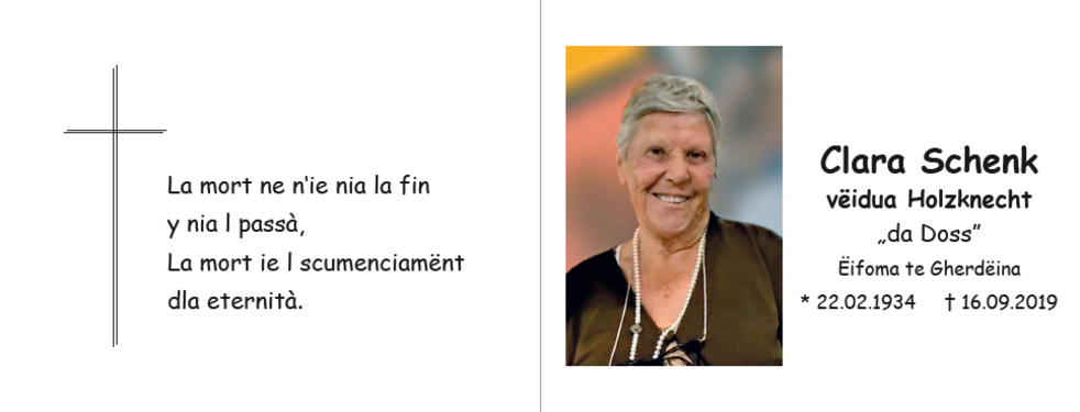 Ein besonderer Dank gilt Hausarzt Dr. Giuliano Piccoliori, allen behandelnden Ärzten und dem Pflegepersonal der Krankenhäuser Bozen und Brixen, dem Hauspflegedienst und den Krankenschwestern des Sanitätssprengels Gröden, sowie den Rettungshelfern des Weißen Kreuzes für die liebevolle Betreuung.