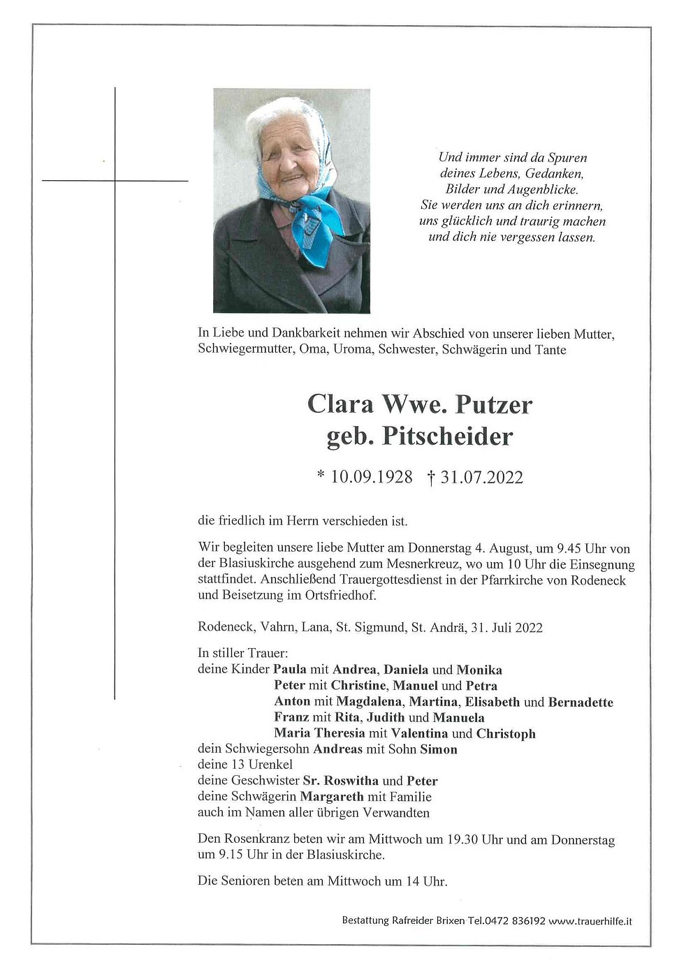 Wir begleiten unsere liebe Mutter am Donnerstag 4. August, um 9.45 Uhr von der Blasiuskirche ausgehend zum Mesnerkreuz, wo um 10 Uhr die Einsegnung stattfindet. Anschließend Trauergottesdienst in der Pfarrkirche von Rodeneck und Beisetzung im Ortsfriedhof.