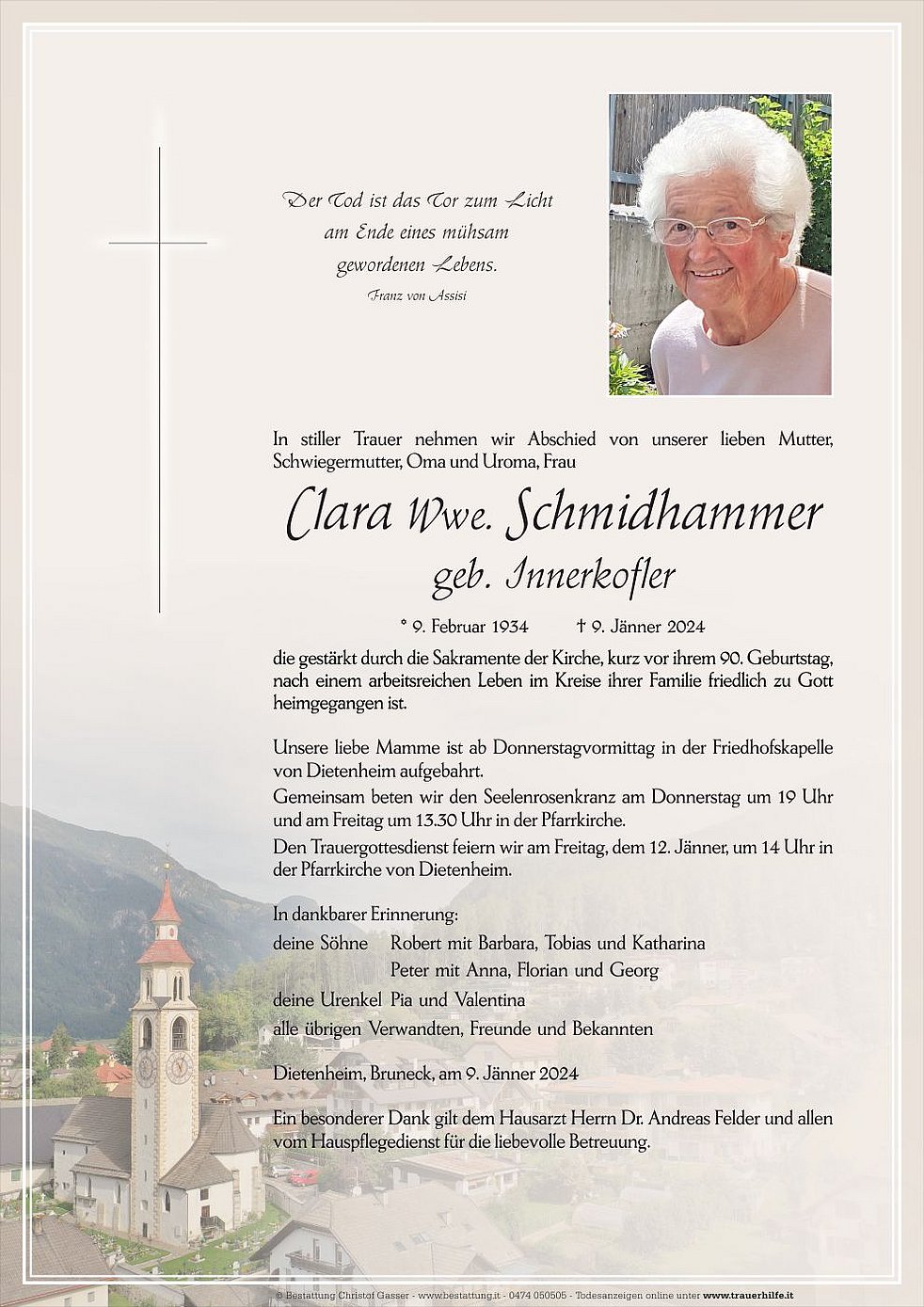 Den Trauergottesdienst feiern wir am Freitag, dem 12. Jänner, um 14 Uhr in der Pfarrkirche von Dietenheim.