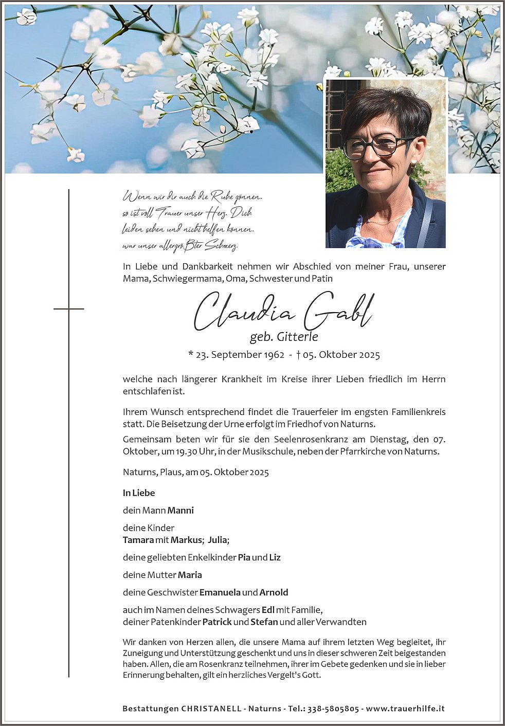 Ihrem Wunsch entsprechend findet die Trauerfeier im engsten Familienkreis statt. Die Beisetzung der Urne erfolgt im Friedhof von Naturns.